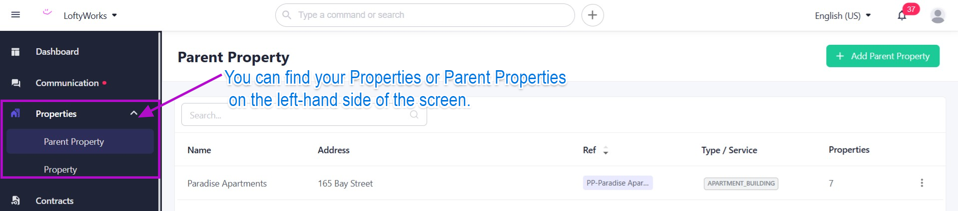 LoftyWorks supports multiple different kinds of units and unit mixes. A Property is any single unit property. If you have multiple units, such as an apartment, office building or other multi-family building, you will link them together with a Parent Property.