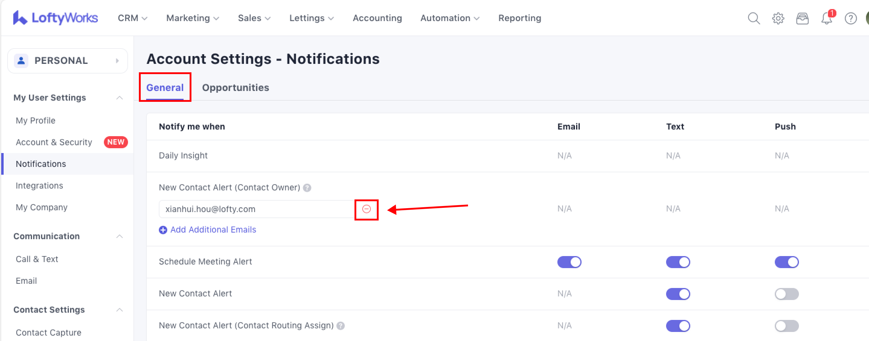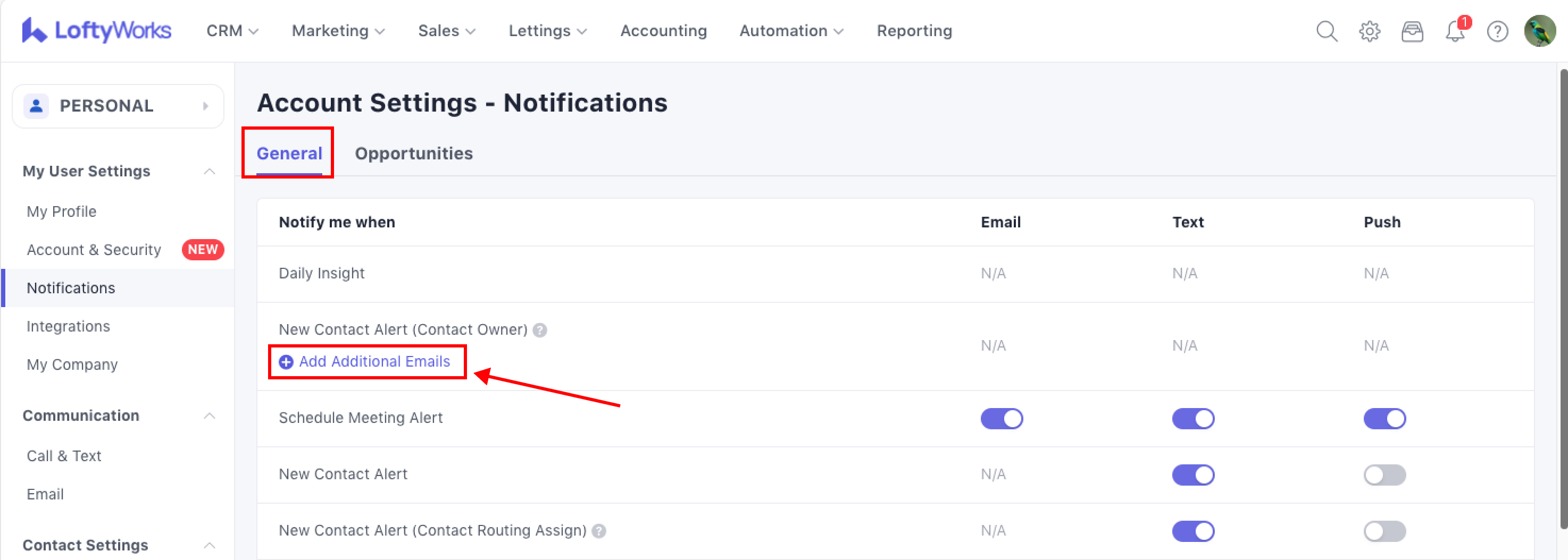 To add an email address to receive LoftyWorks's new contact alert, please follow the steps below: