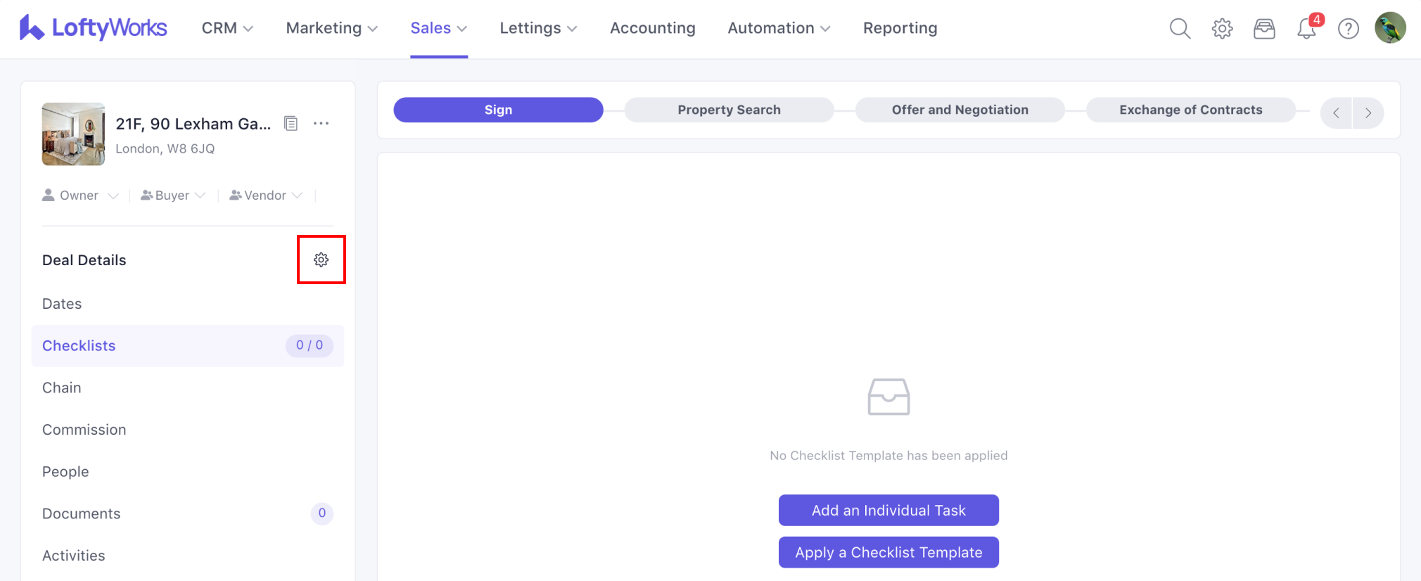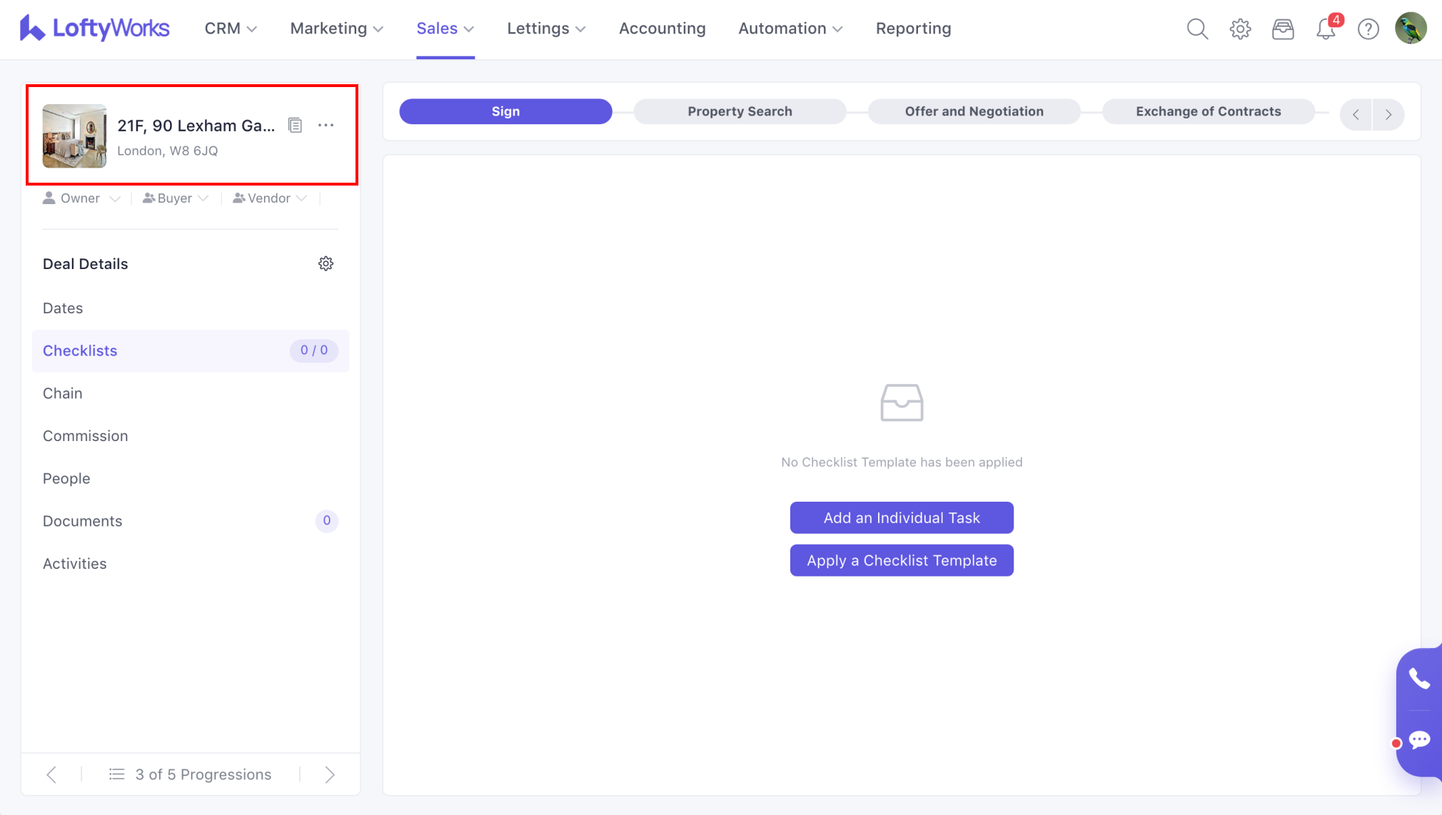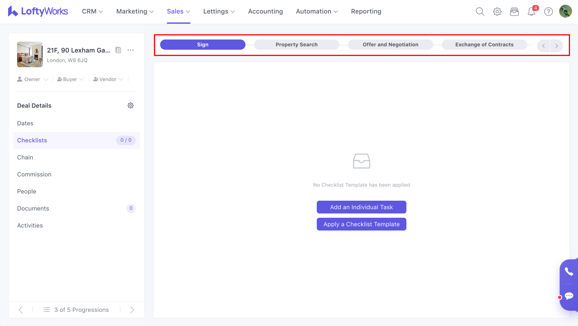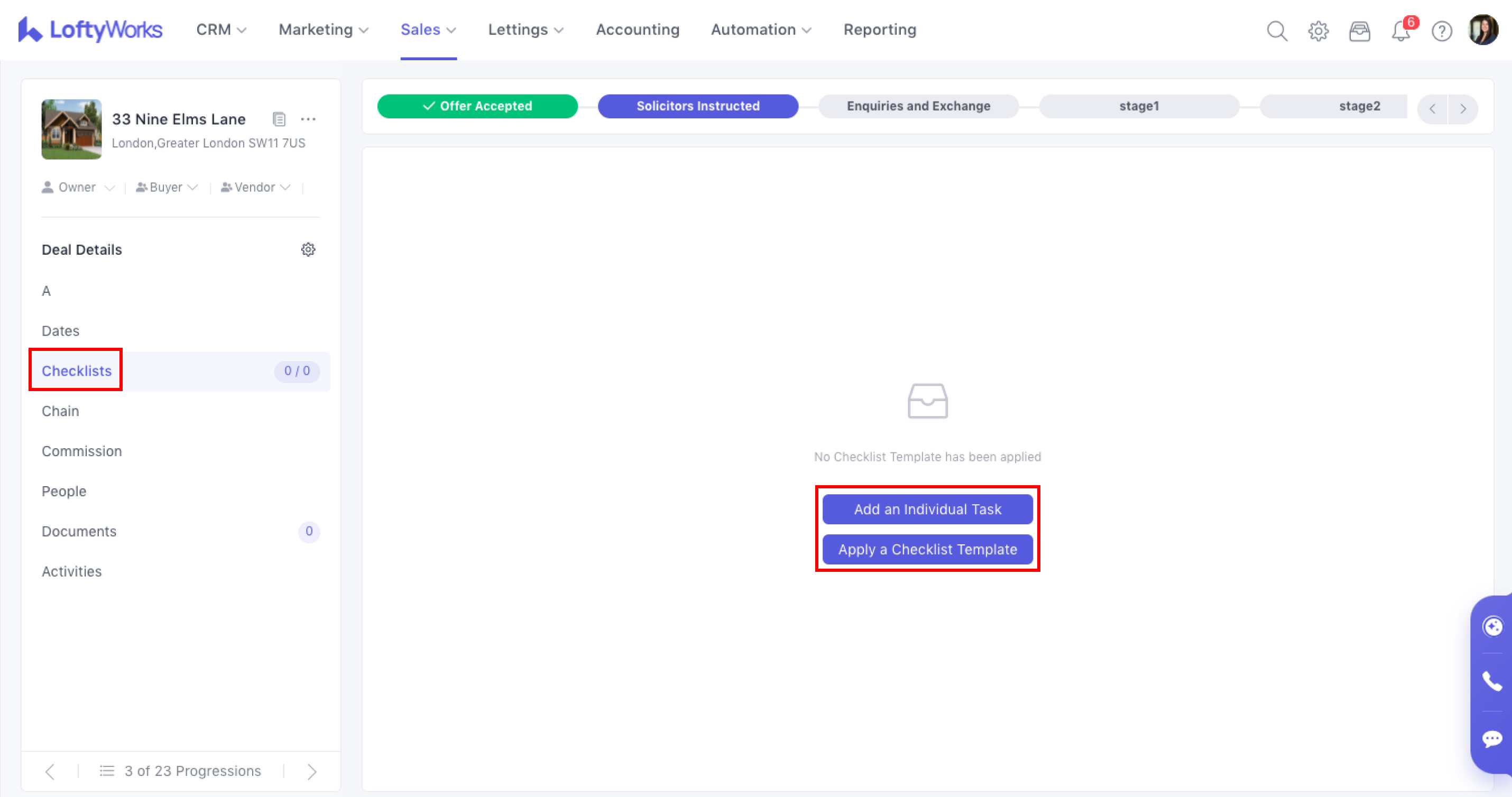 Under the Checklists tab, you can add individual tasks or apply a checklist template. A checklist can be used to create tasks automatically as a progression is moved to different stages in the pipeline. To learn more about this feature, please refer to the following: Checklists in Sales Progression.