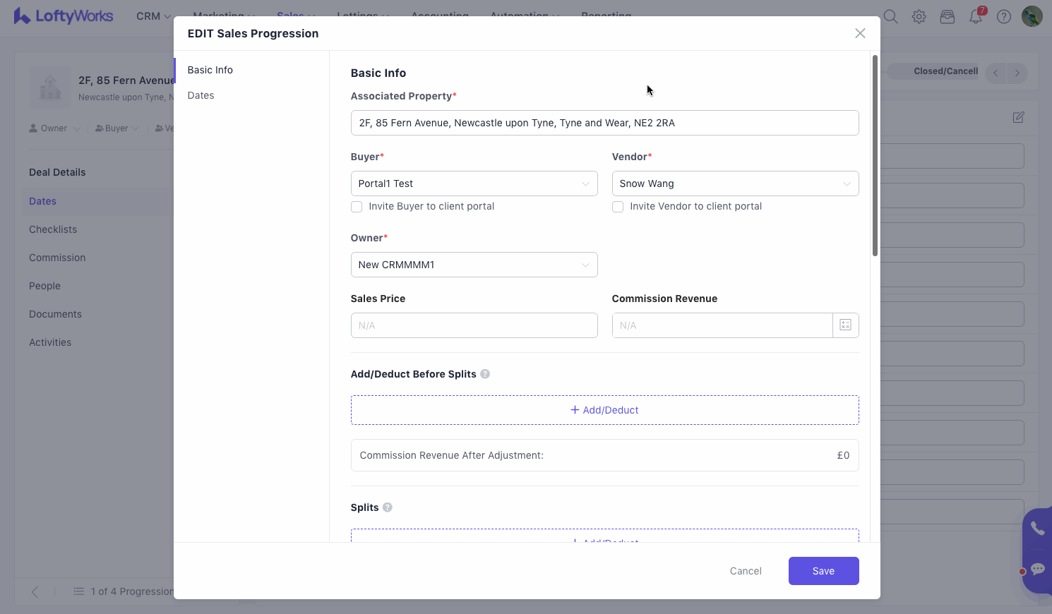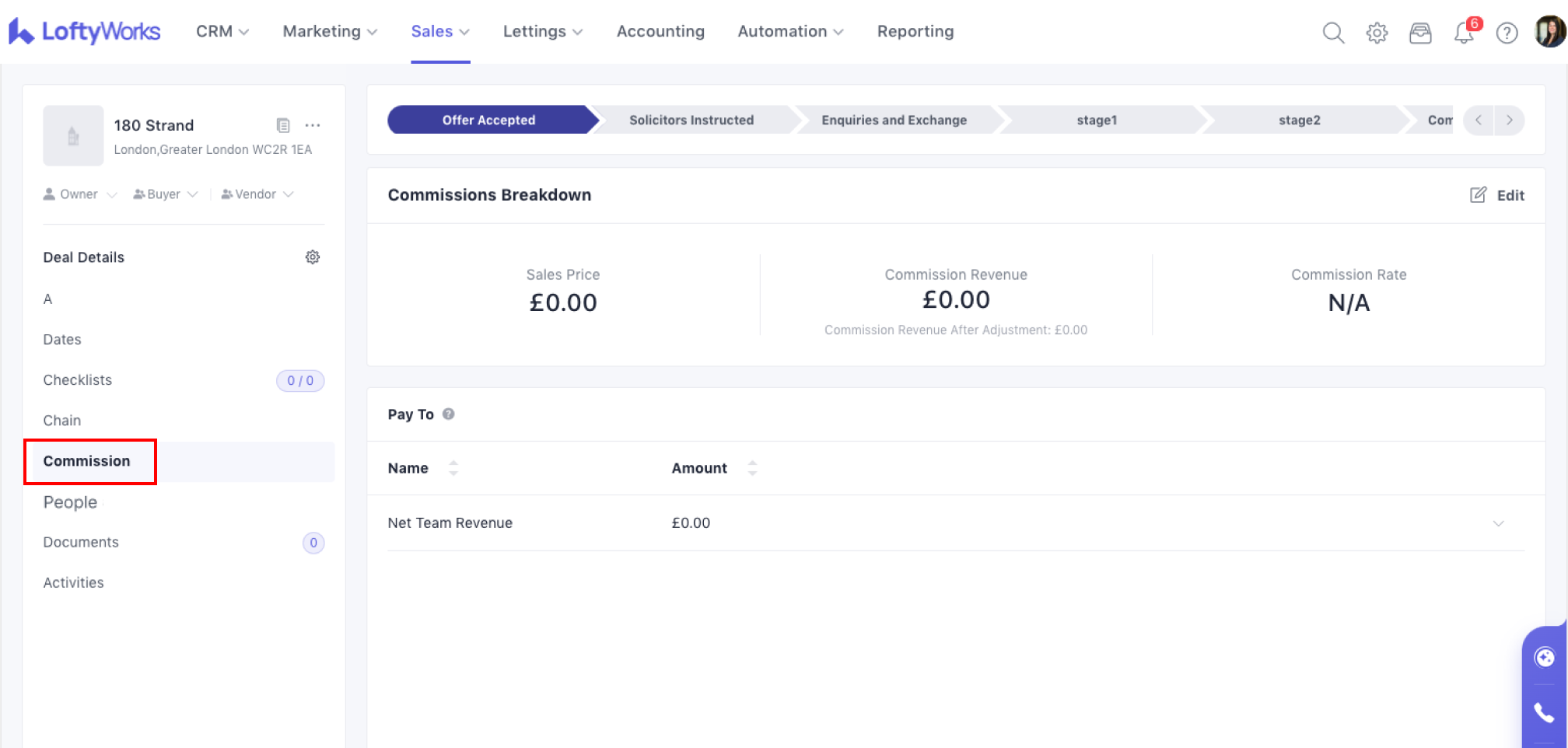 The Commission tab will show you the progression numbers. This is also where you can add or edit the splits related to the progression. Reference Commission in Sales Progression for detailed information about commission.