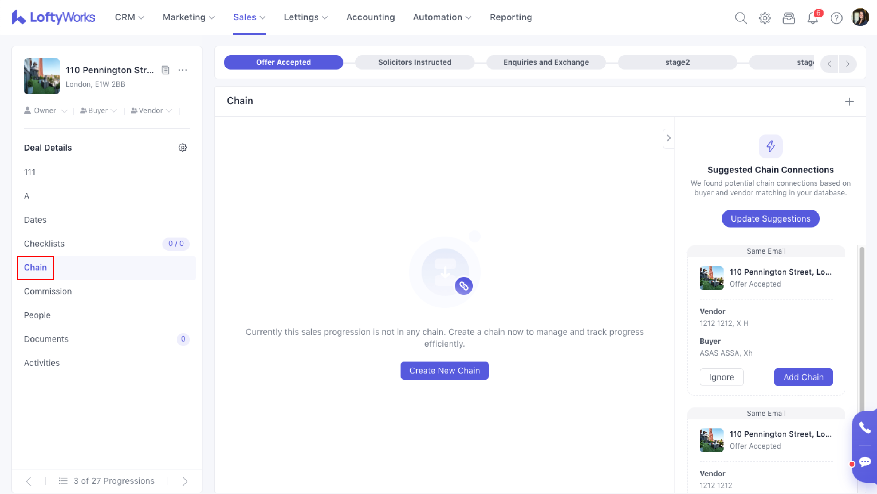 A chain is the sequence of dependent sales progression linked together, where each move relies on another completing successfully. For more information, please refer to the following: Chain Management in Sales Progression(relink)