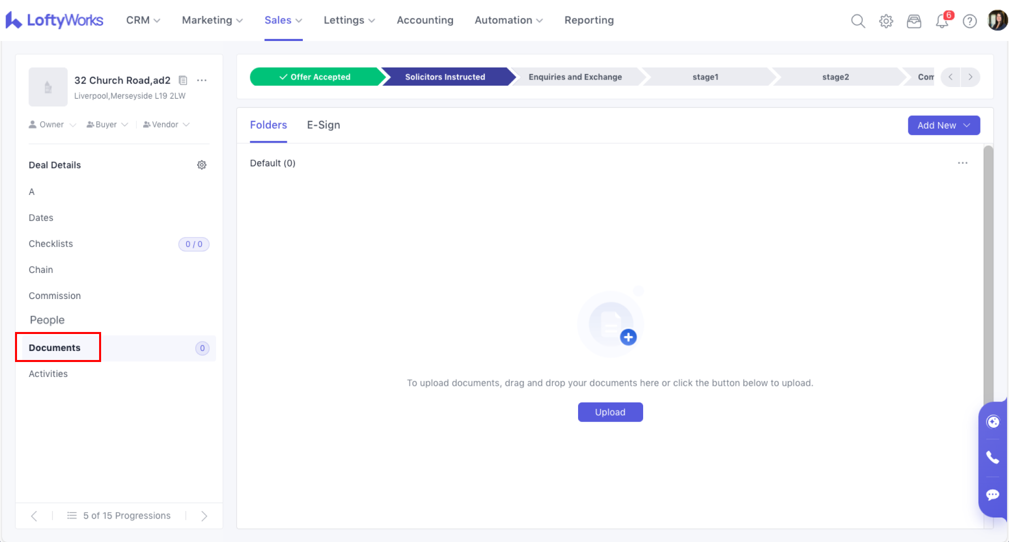 You can upload documents that are intended to be saved with this progression to the Documents tab. To use a document, you can access it here, but will have to download to your computer and then upload it elsewhere as needed. Check Documents in Sales Progression for detailed information about documents.