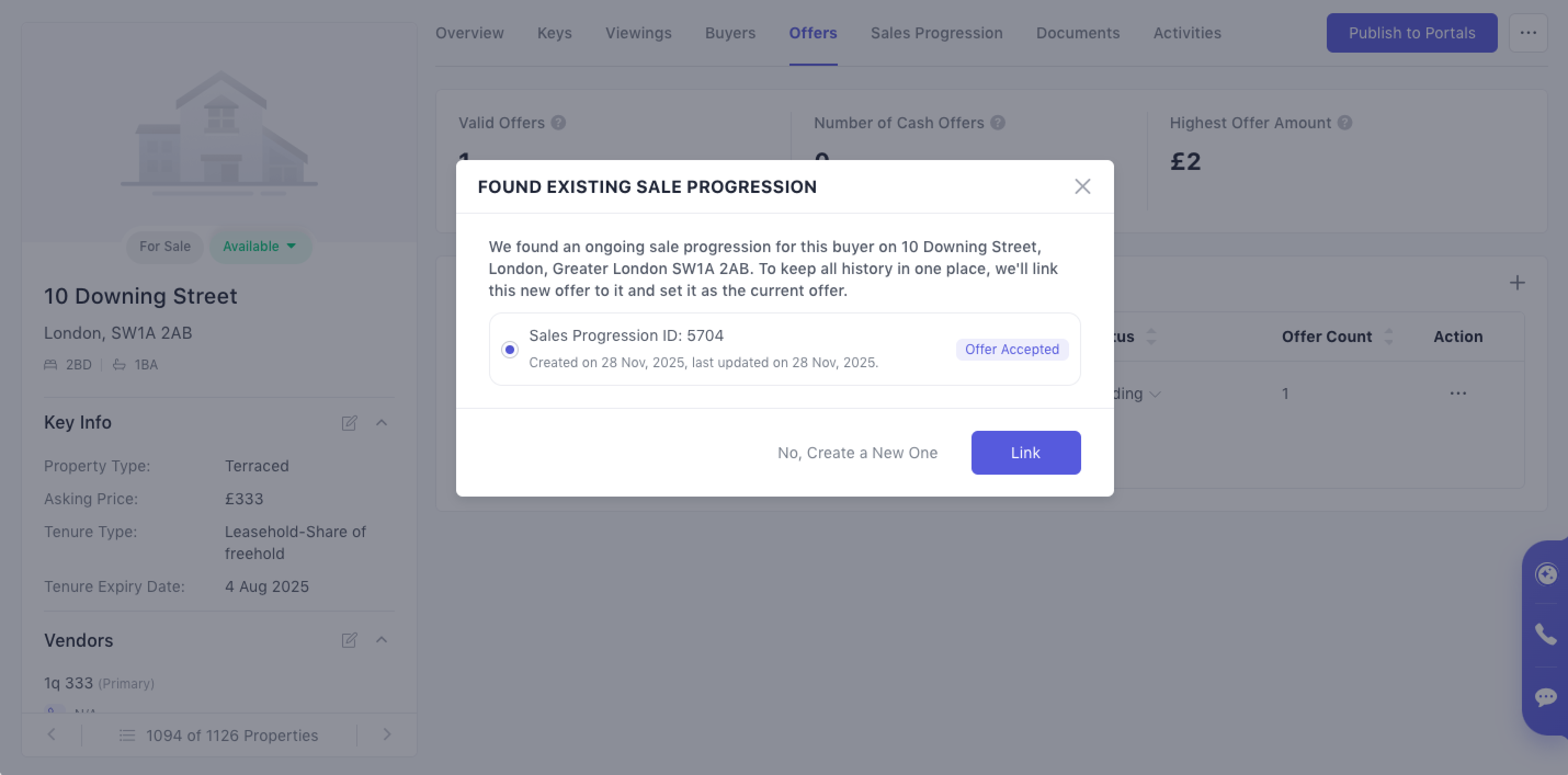 Only one active or completed Sales Progression can be linked to any Offer