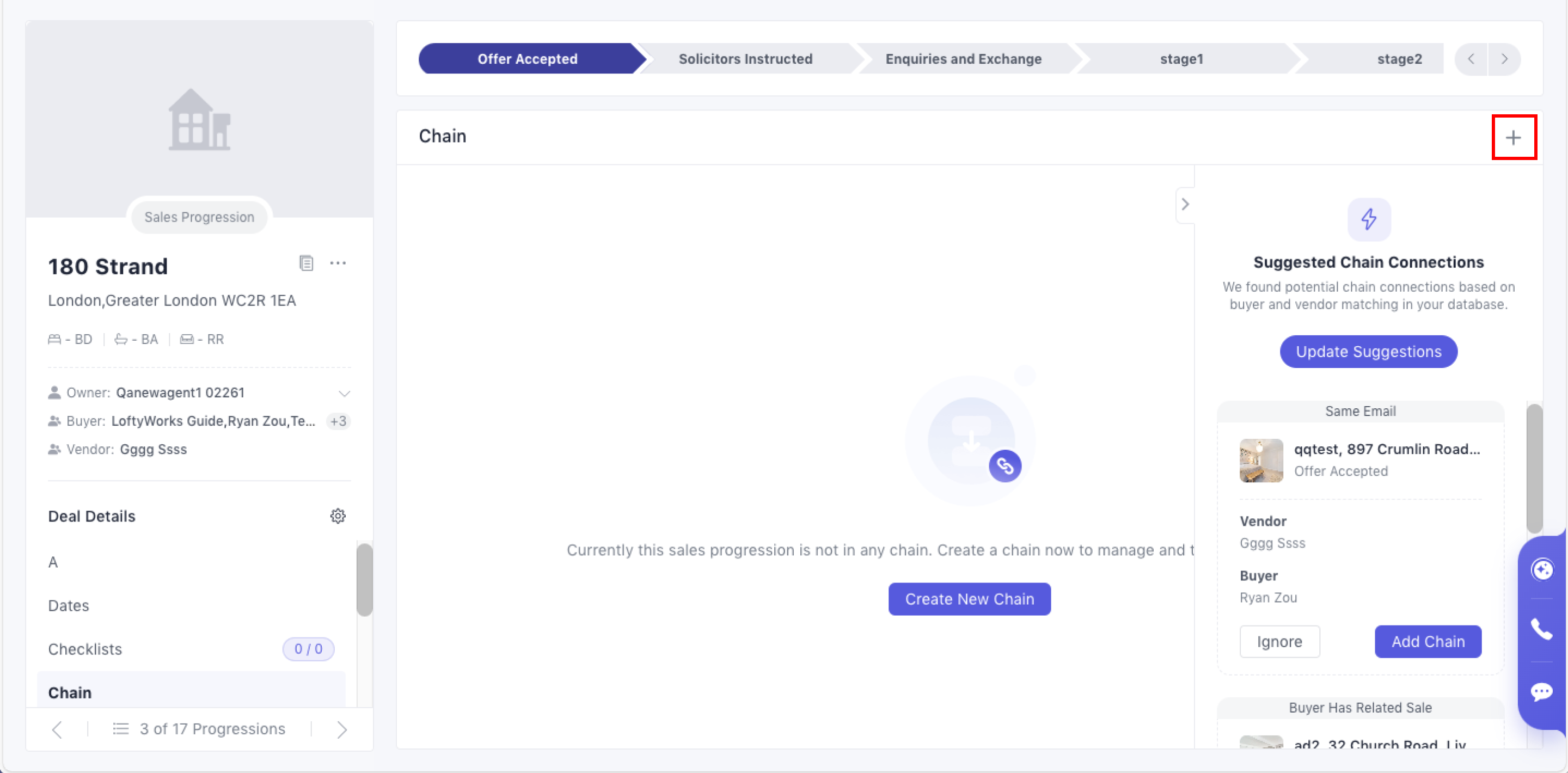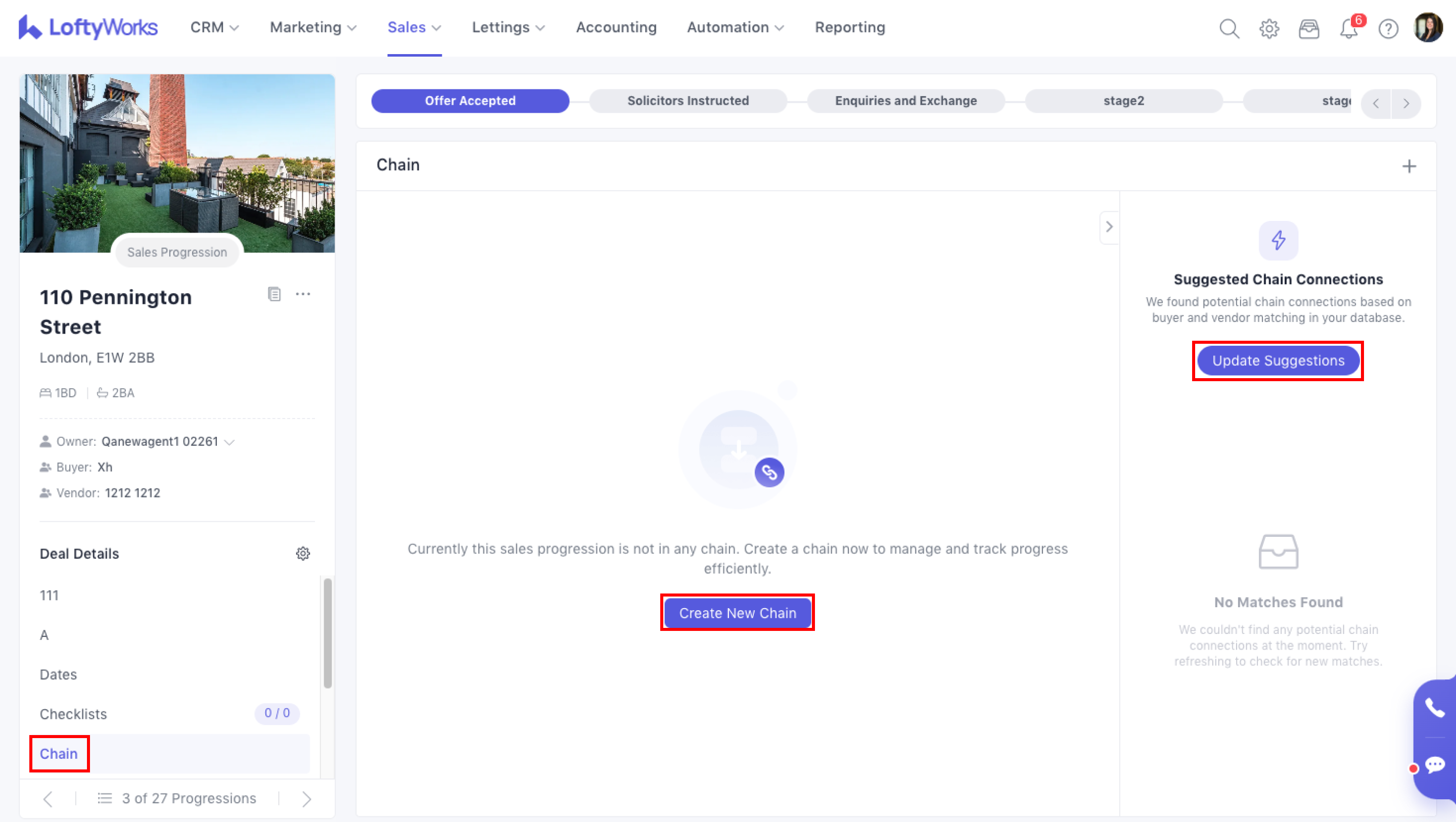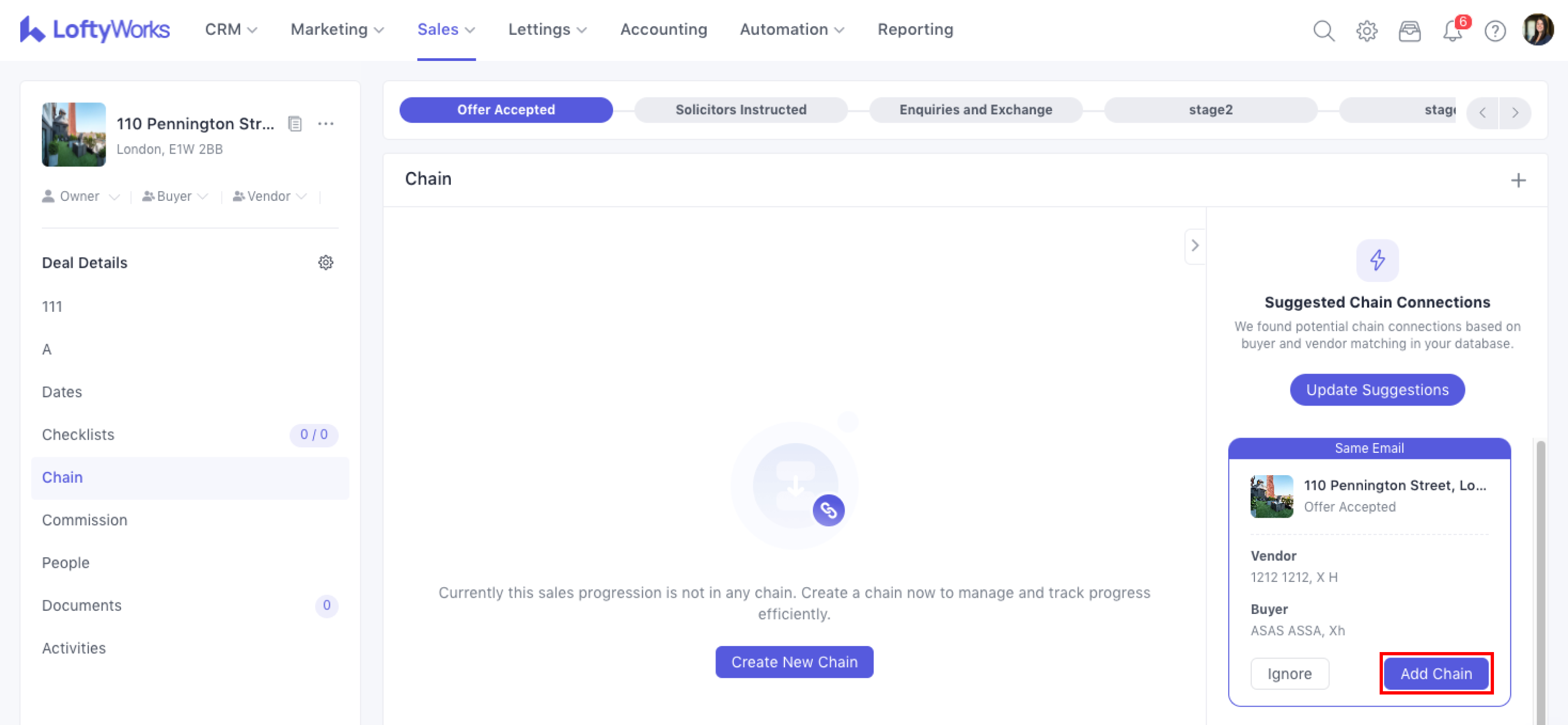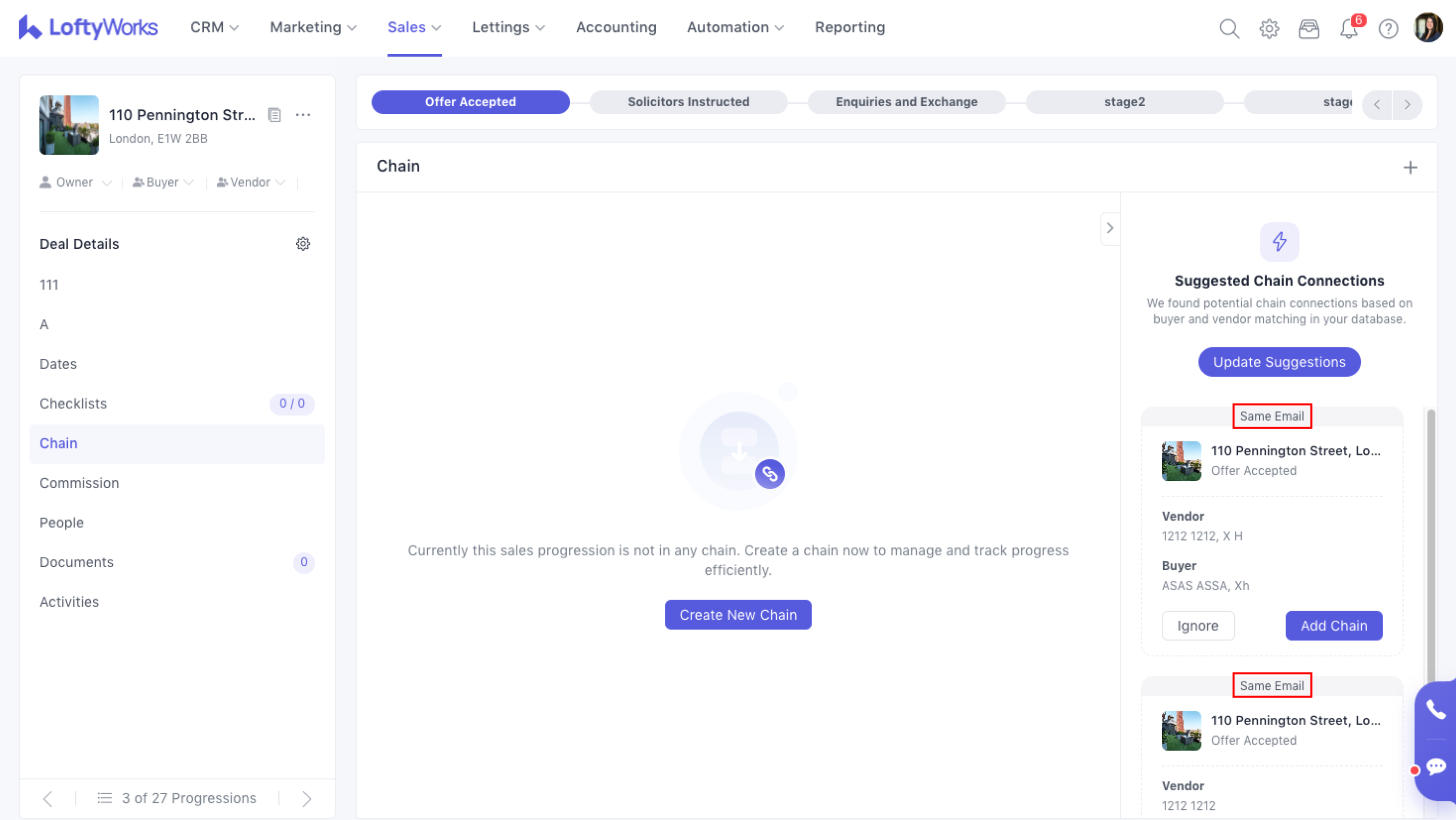 Inside any Sales Progression, go to: Sales Progression → Left Sidebar → Chain.