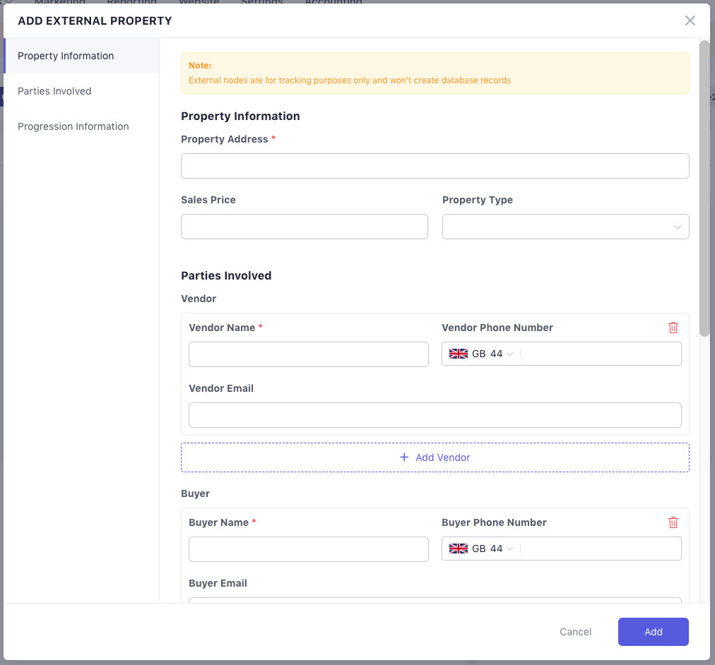 A representation of a progression managed by another estate agent or party. It does not create an actual property record in LoftyWorks.