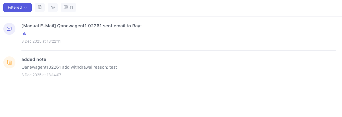 Any logged communication appears in the activity list. Notes added by agents, call logs, text logs and emails follow the same format used in the Contact Detail Page, with the difference that: