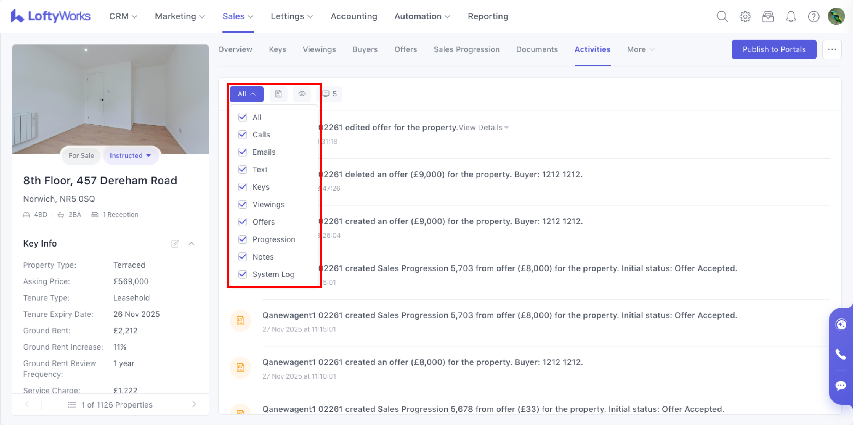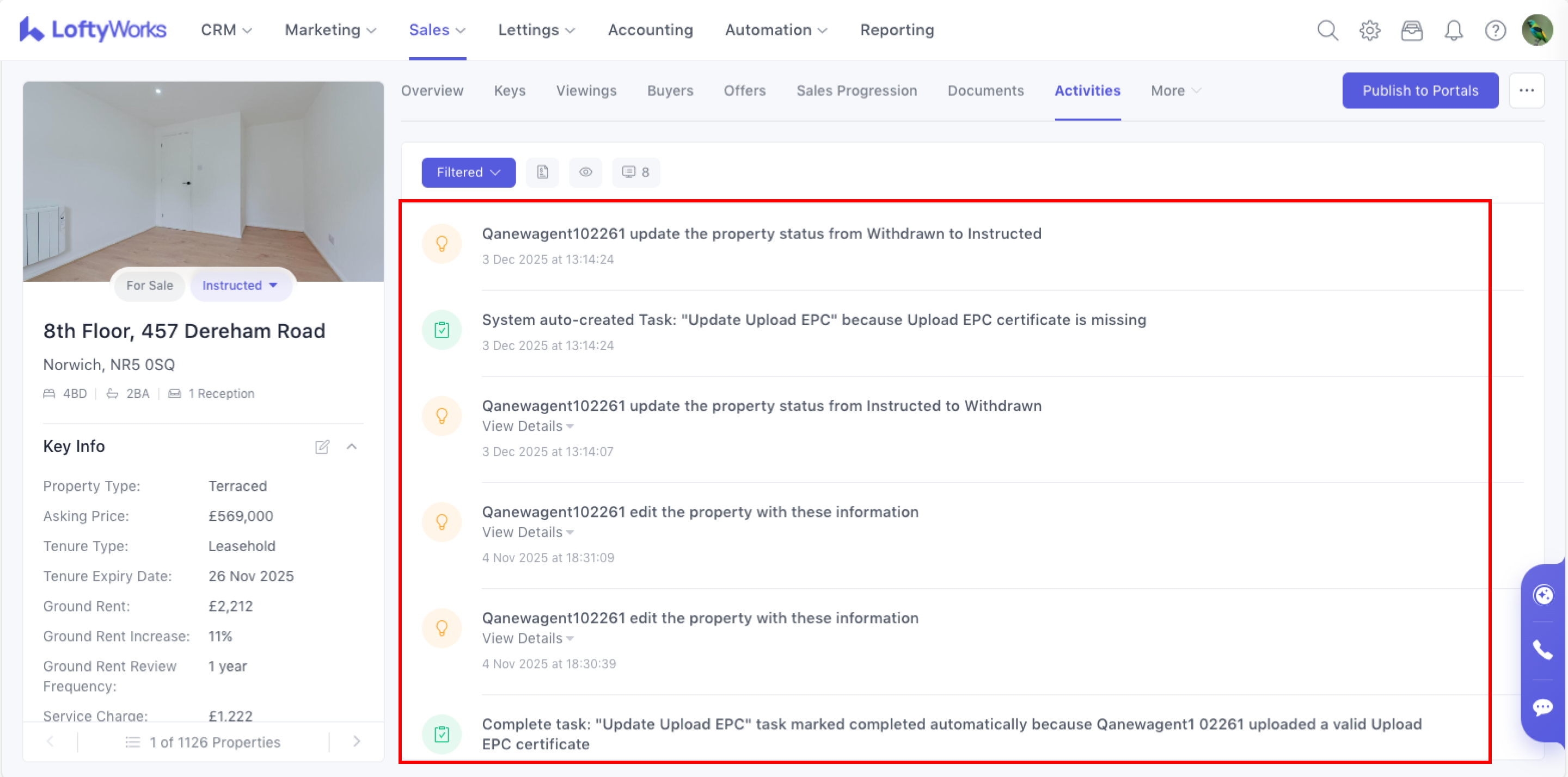 The Activities tab gives you a complete history of everything that has happened on a For Sale property. It is always the final tab, no matter what status the property is in (Instructed, Available, Under Offer, Exchanged, Sold or Withdrawn). This is where you can review communication, changes, system actions and interactions related to the property.