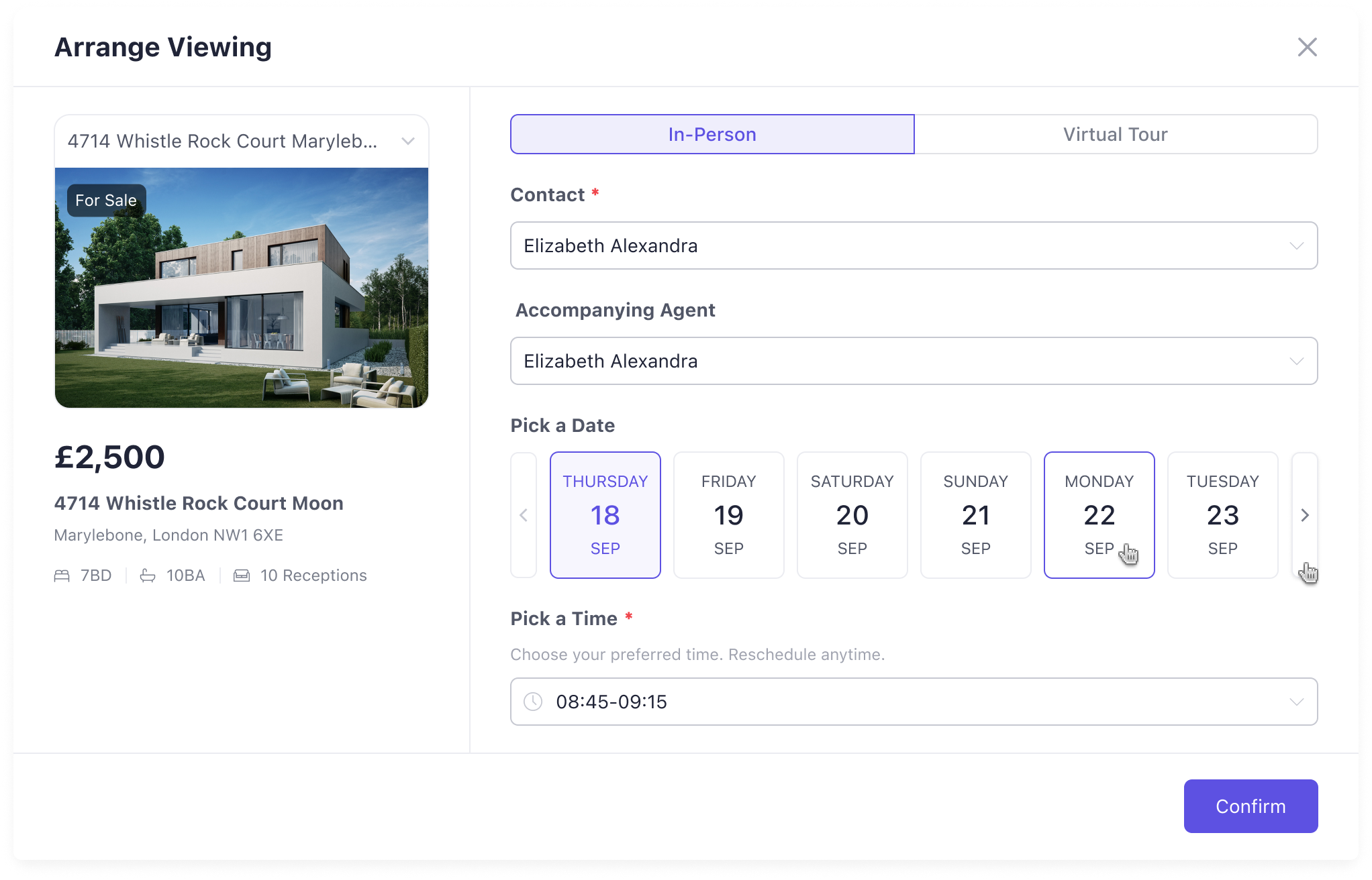 Available time slots follow the property’s Viewing Instruction Configuration.