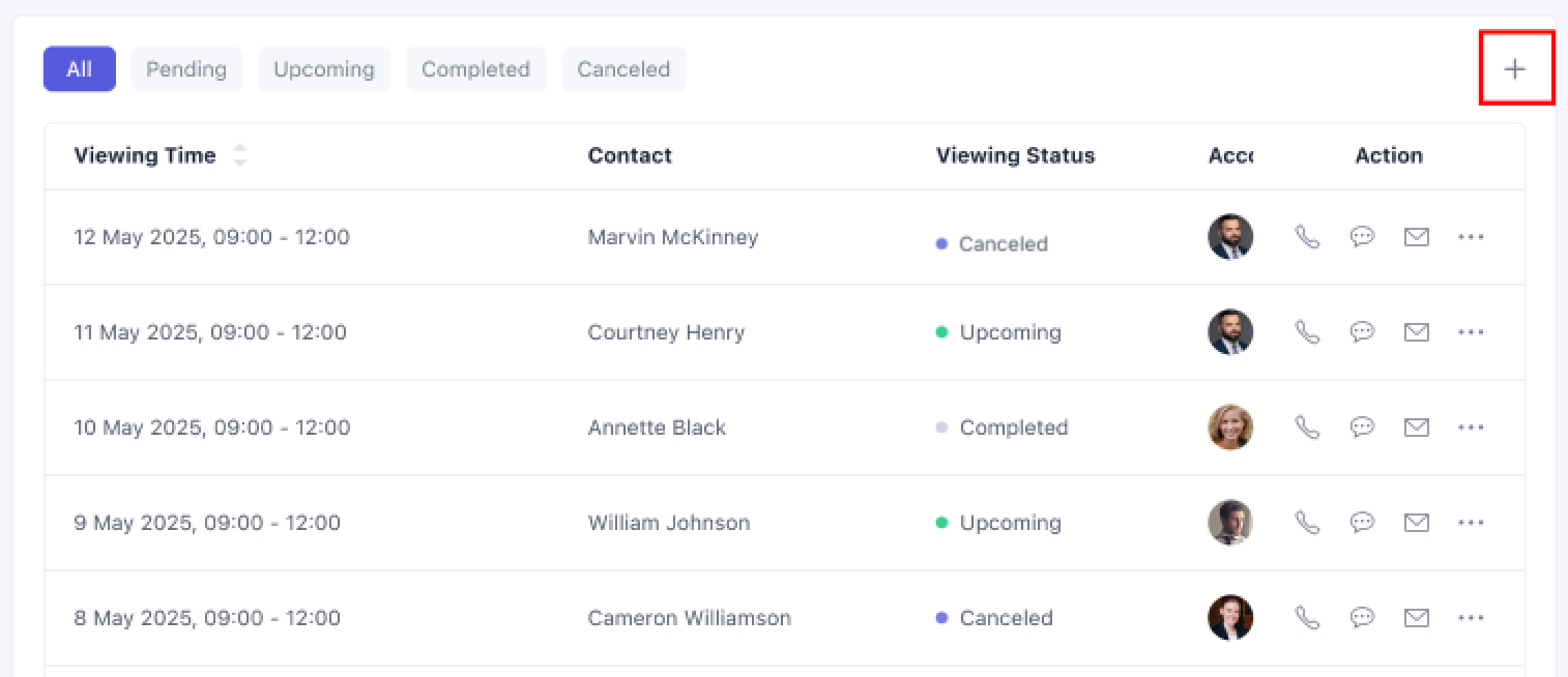 Click + Arrange Viewing at the top right of viewings list to book a new appointment. This button appears when the property status is: Instructed,Available or Under Offer.