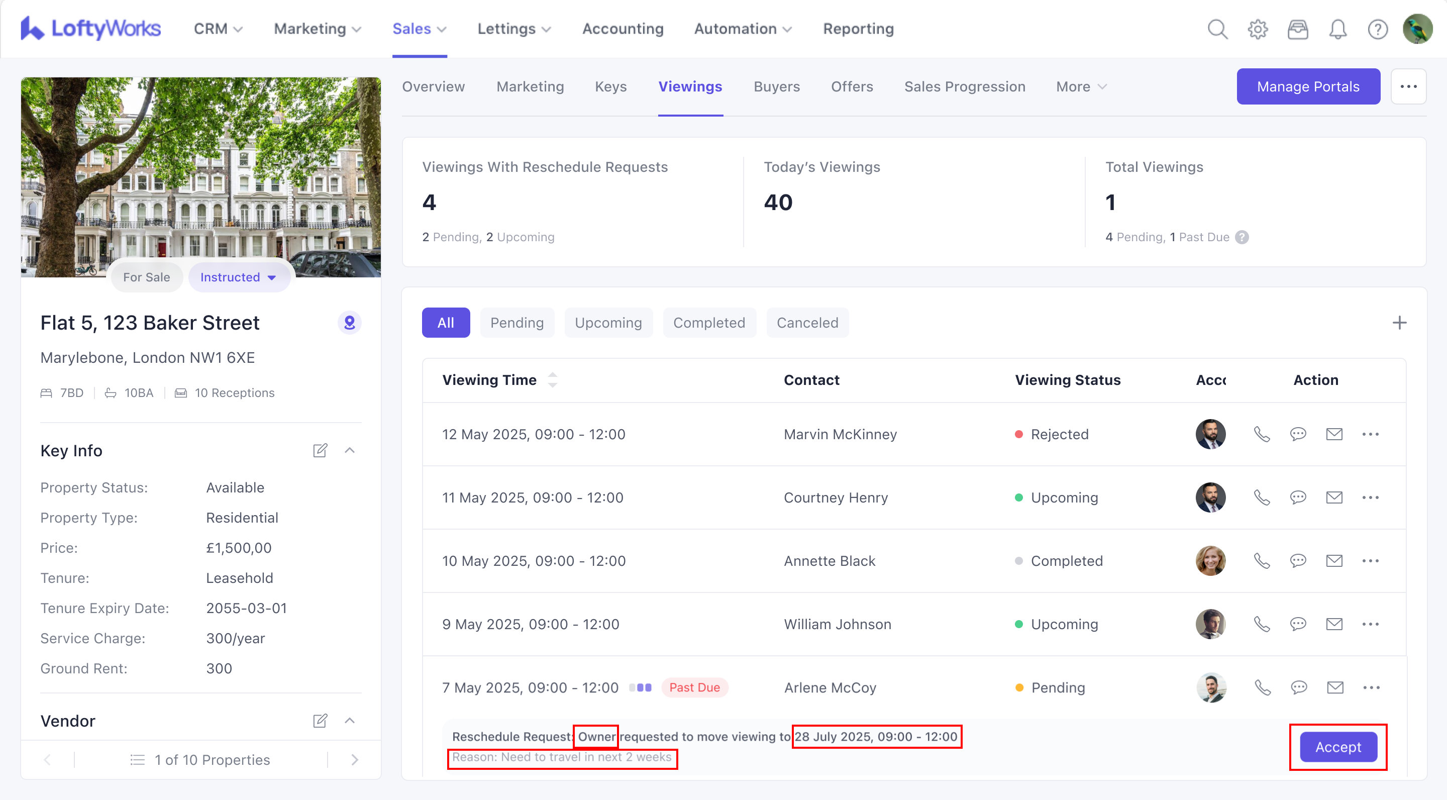 Viewings with Reschedule Requests : Displays the number of viewings that currently have reschedule request.