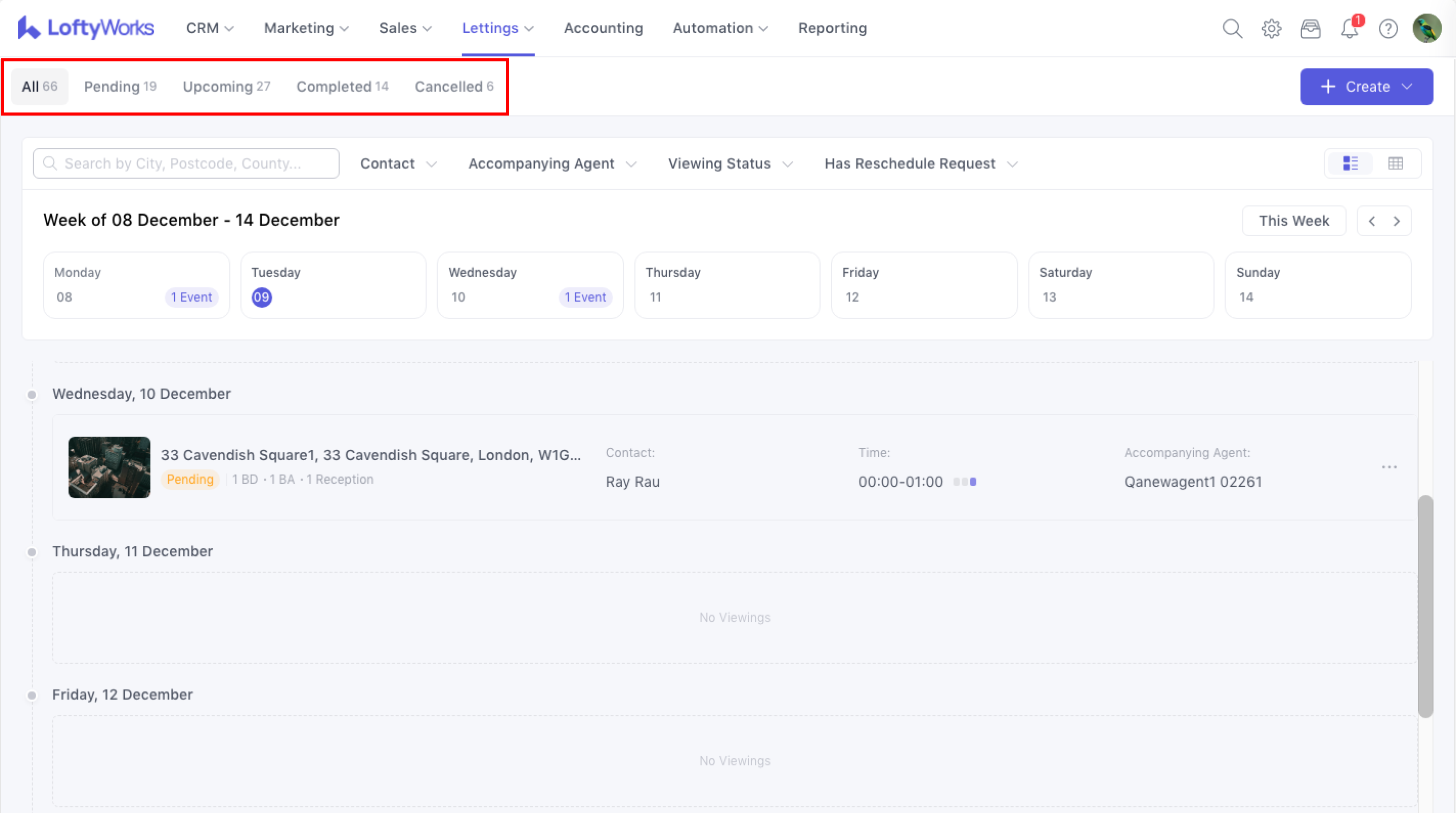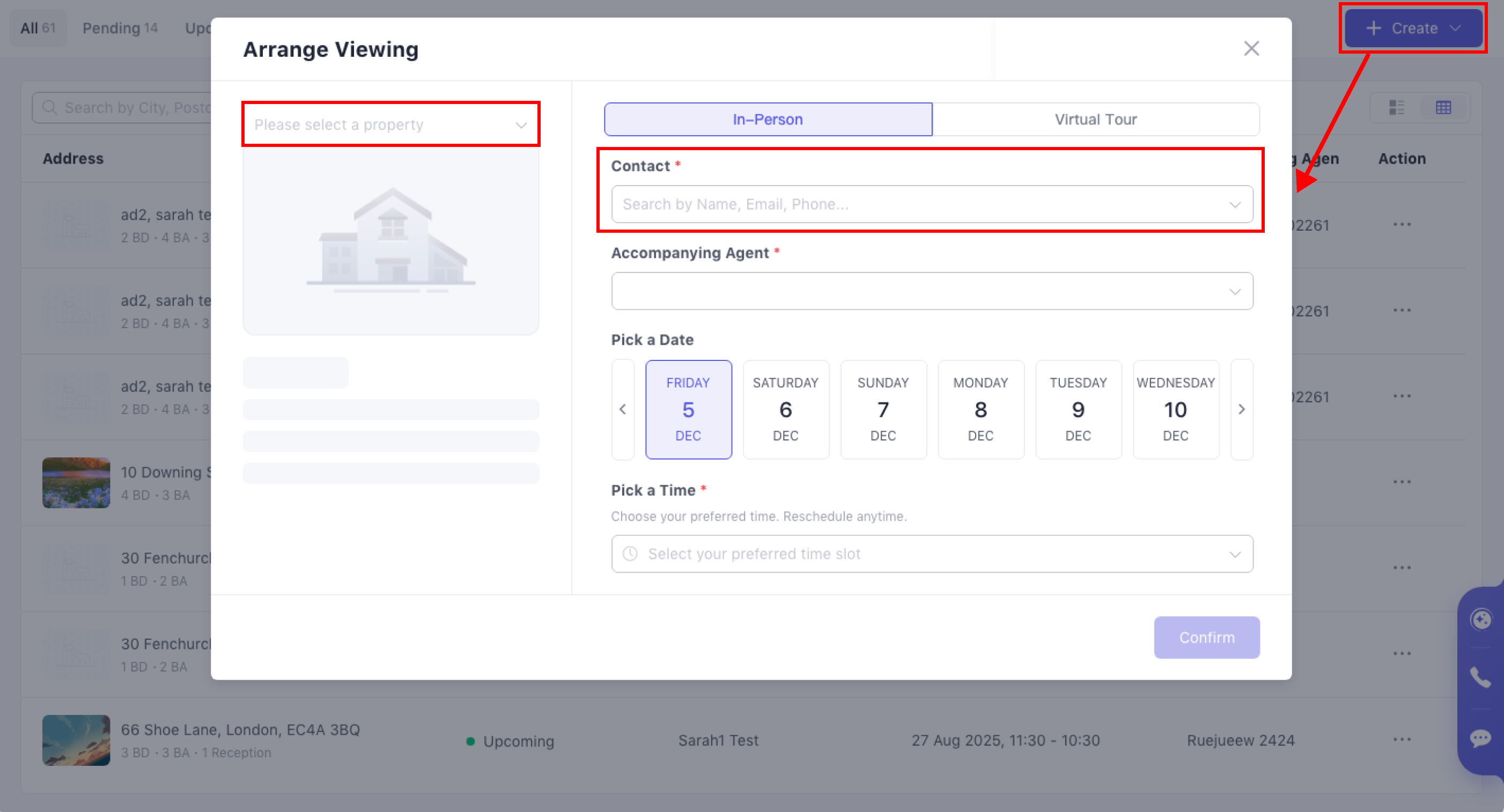 Click Create at the top right of viewing list page → opens the Arrange Viewing modal, identical to the one in the Viewing tab (link).