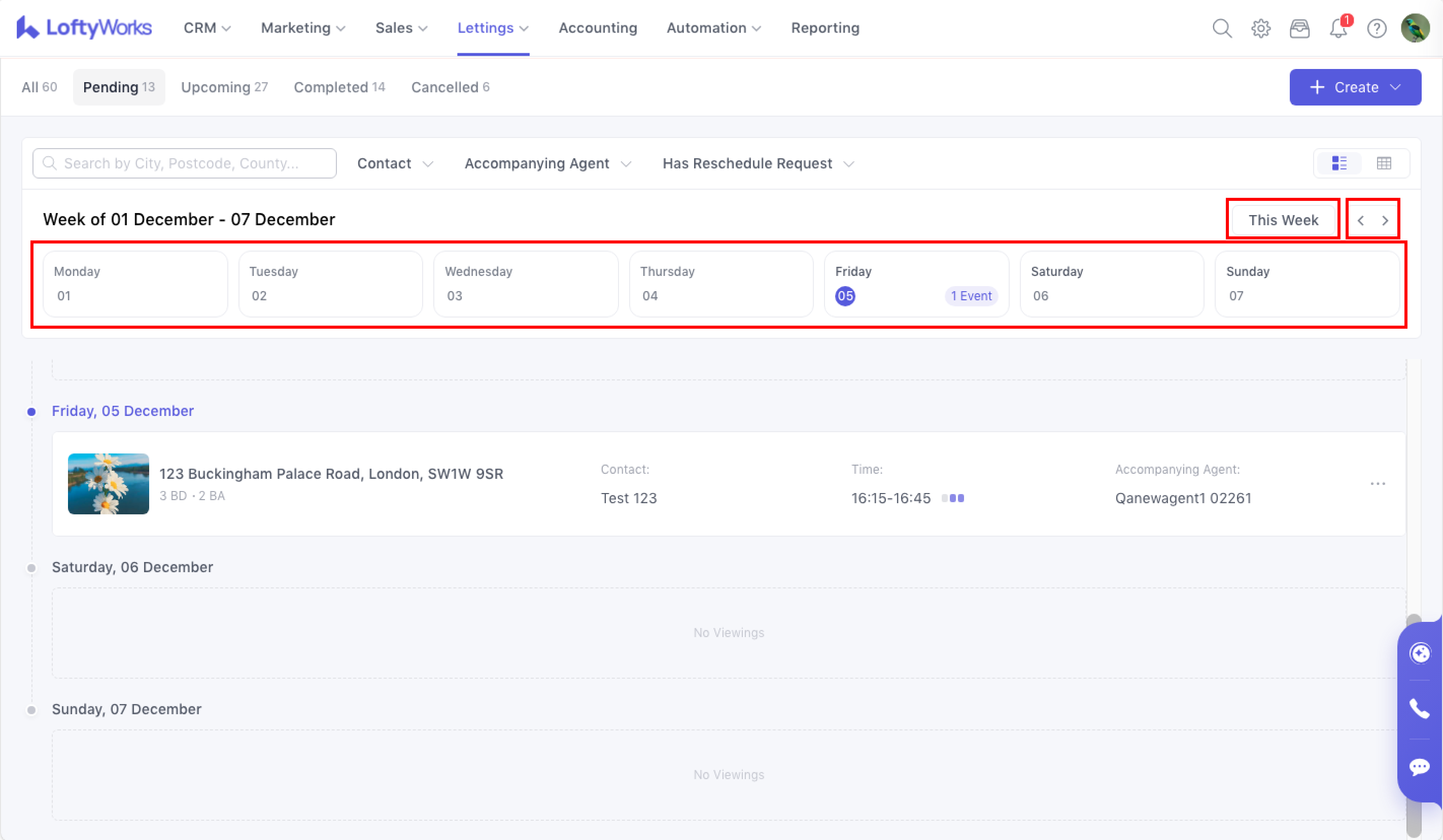 To access the viewing list, click Lettings → Viewings, the system opens the Viewing List. Only viewings for For Let properties are displayed.