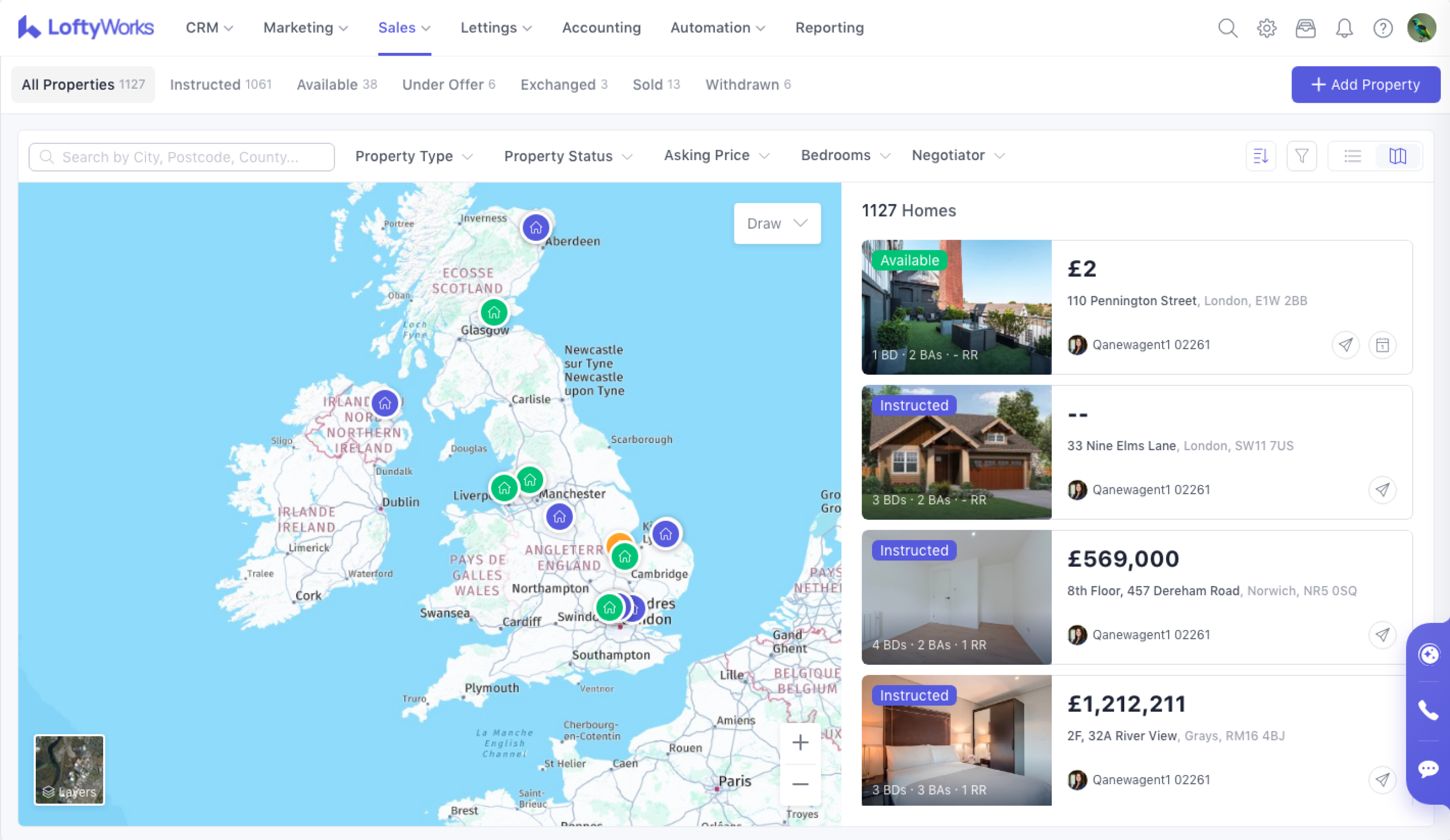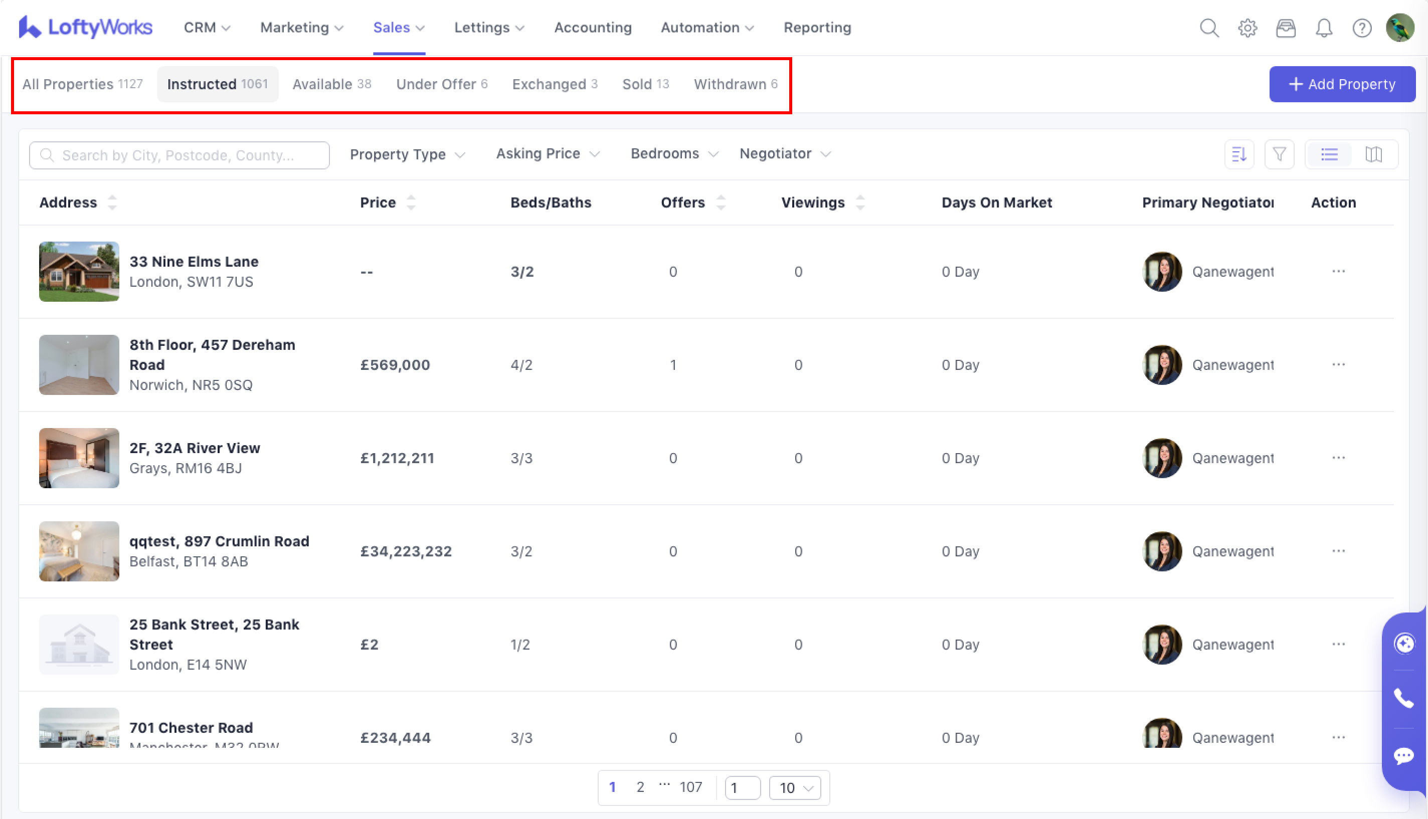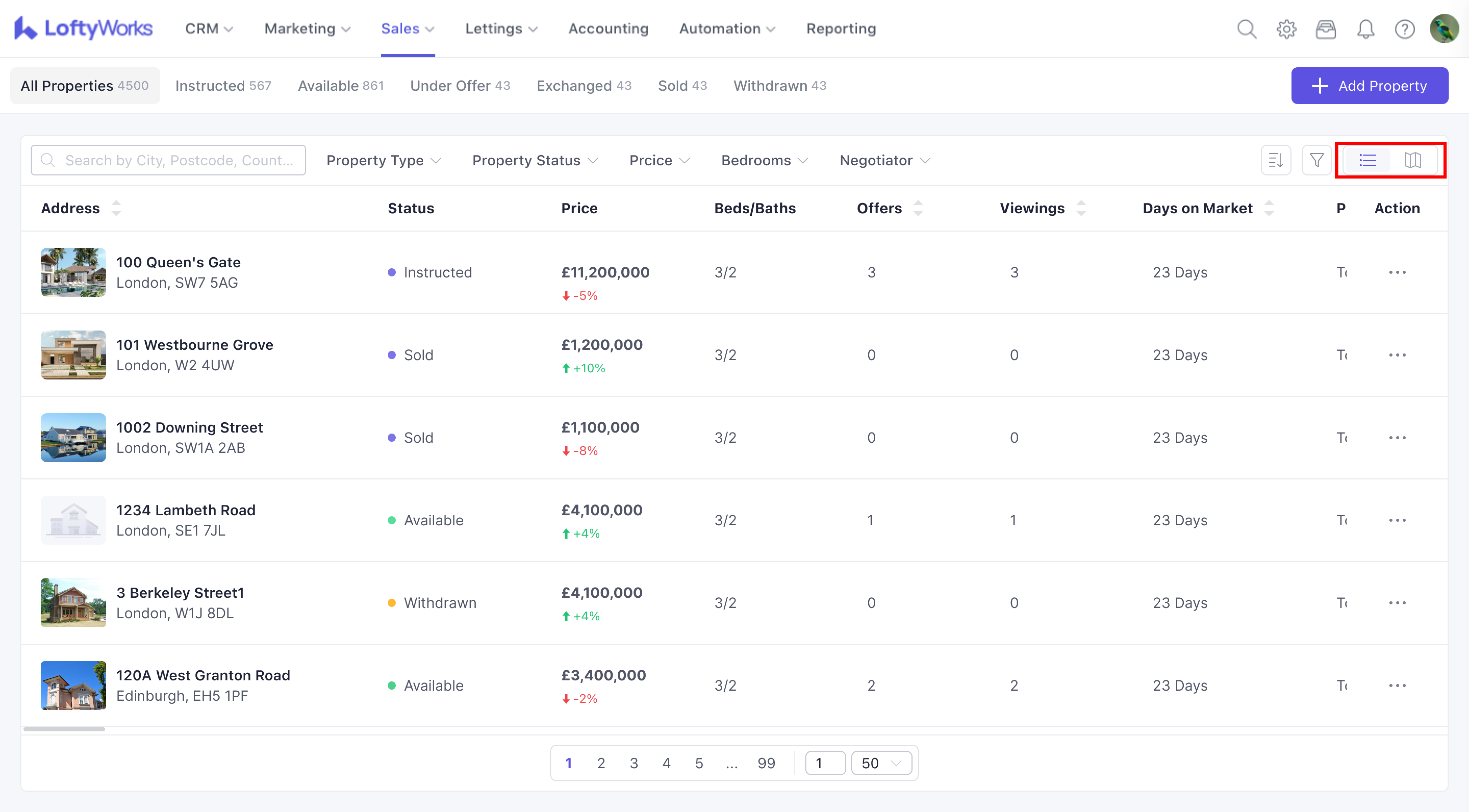 The Property List page allows you to view, filter, and manage all properties currently listed For Sale. This article explains how to navigate the list, switch views, apply filters, and perform key actions.