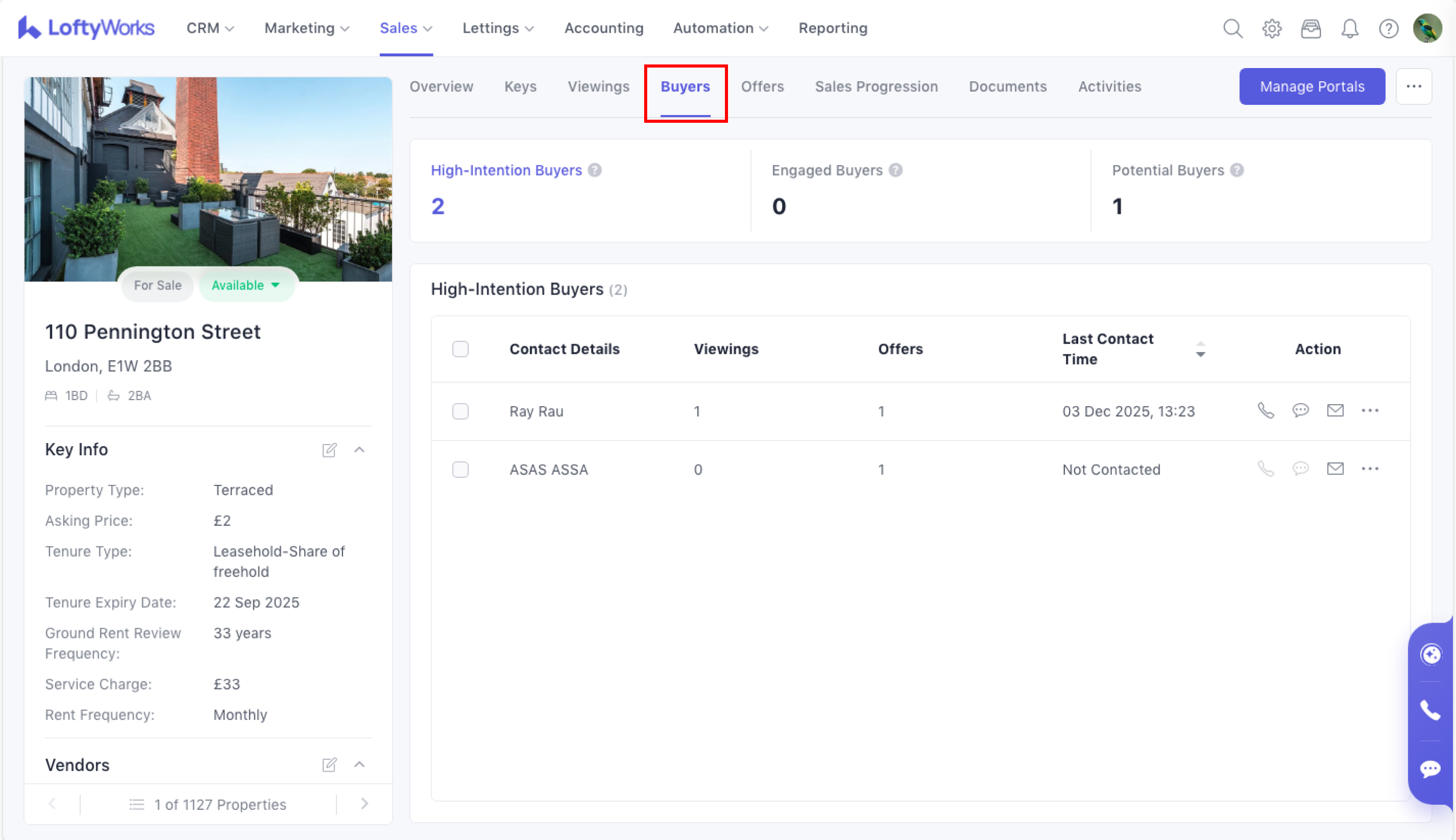 In any sales property's detail page → click the Buyers tab (which is located between Viewings and Offers.)