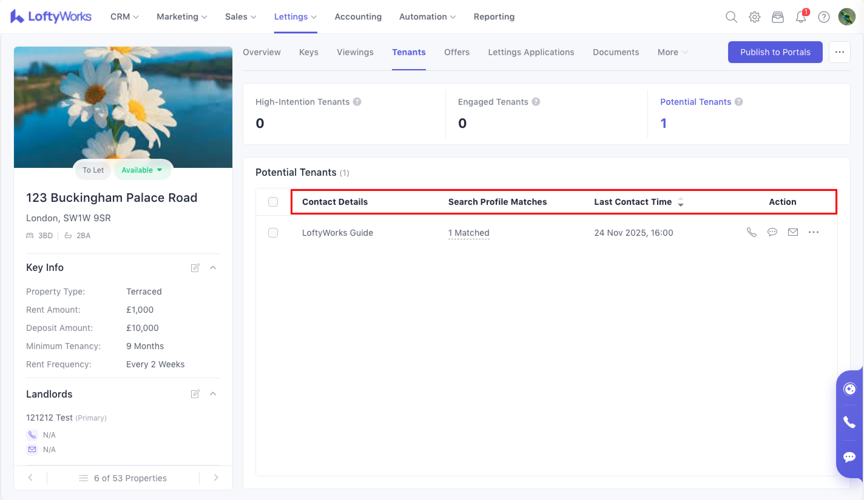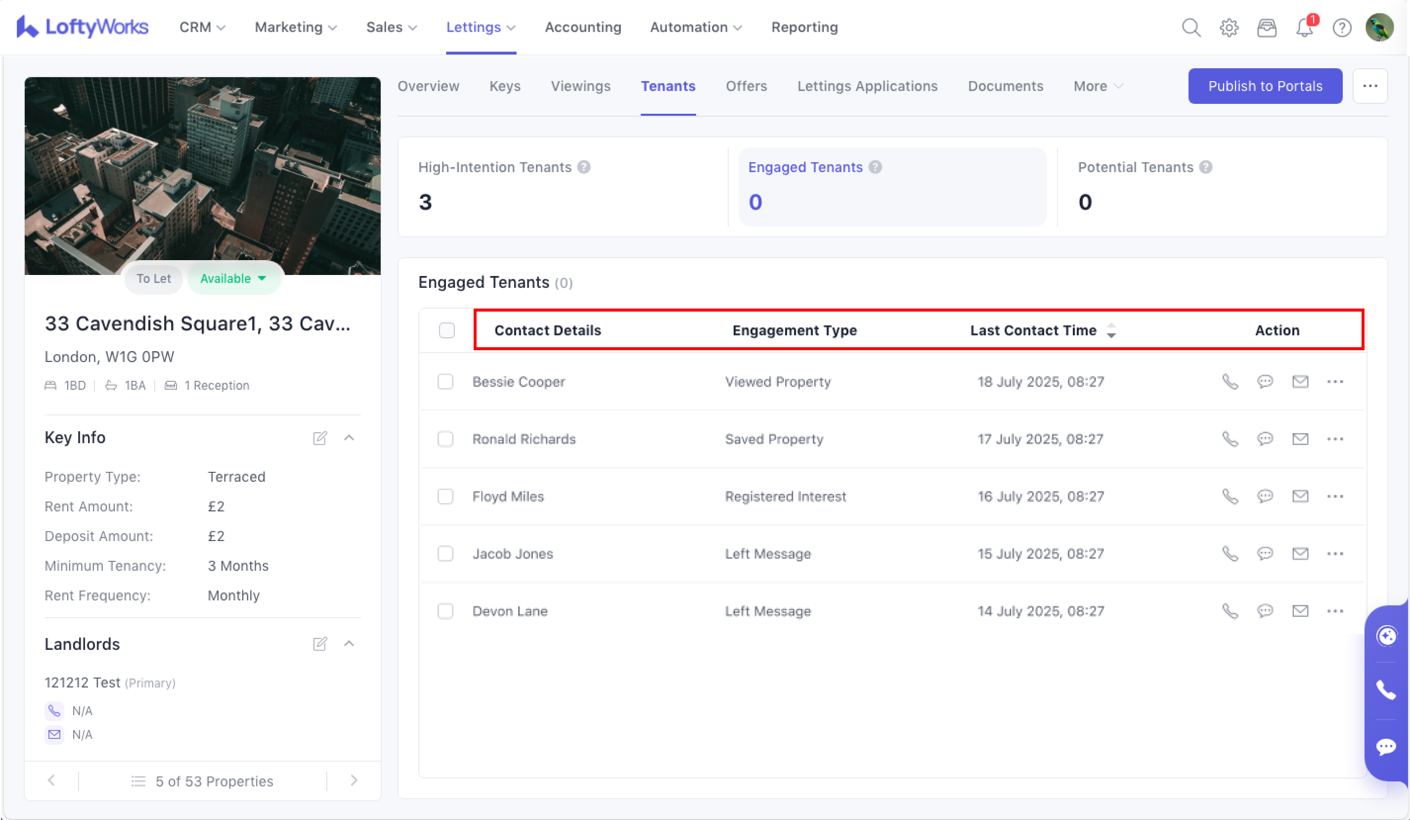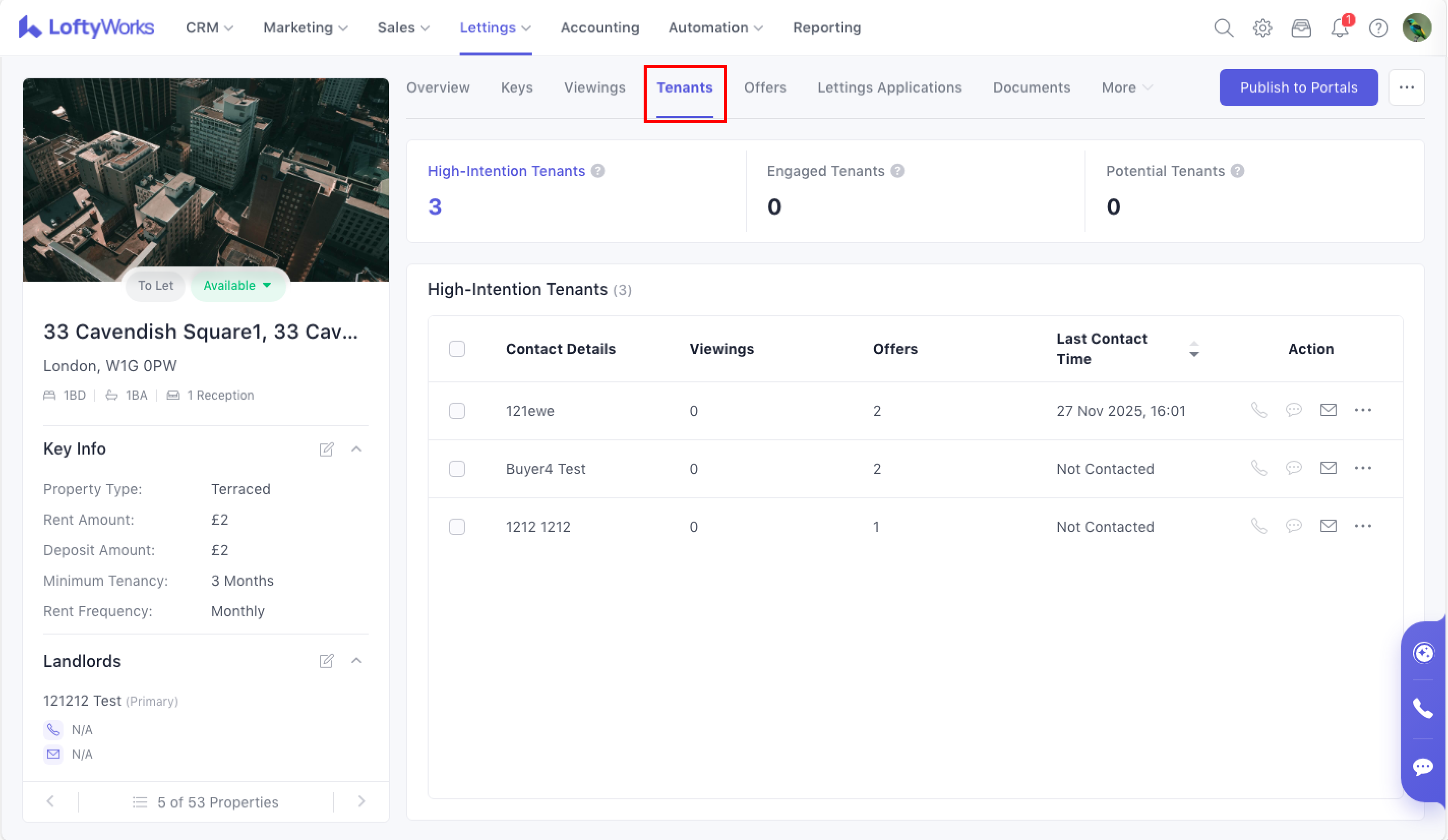 The Tenants Tab helps you understand which contacts are actively engaging with a To Let property. It groups tenants into meaningful categories—High-Intention, Engaged, and Potential—so you can prioritise follow-up and manage interest efficiently.