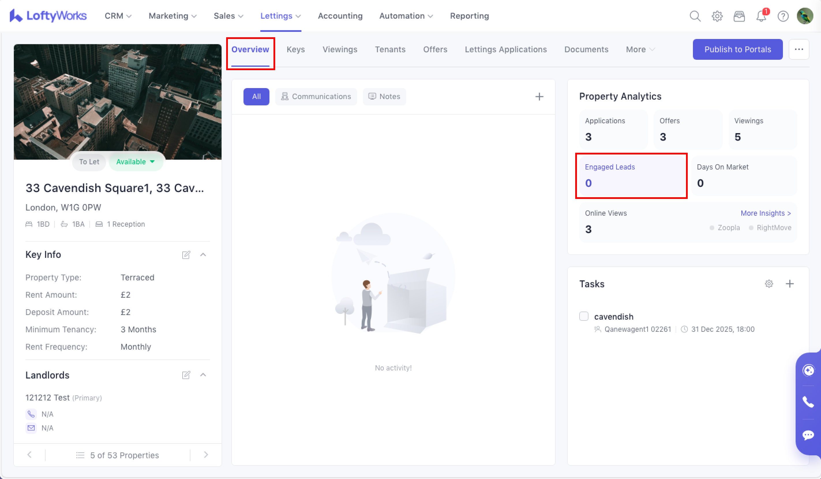 Property Detail Page → Overview → Property Analytics → click Engaged Leads to jump directly to the Tenants tab.