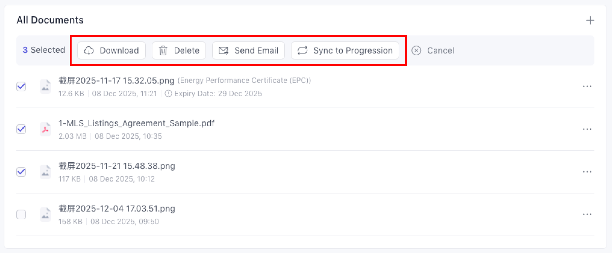 A list of all documents uploaded to this property, including documents added during property creation