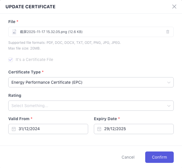 Compliance document details (shown only if the file is a certificate)