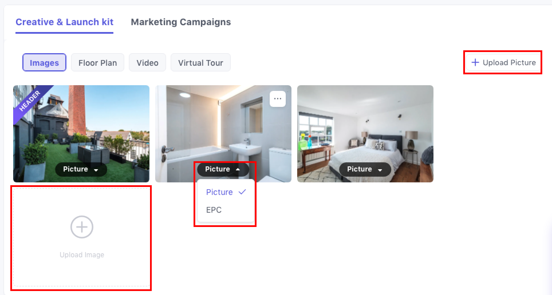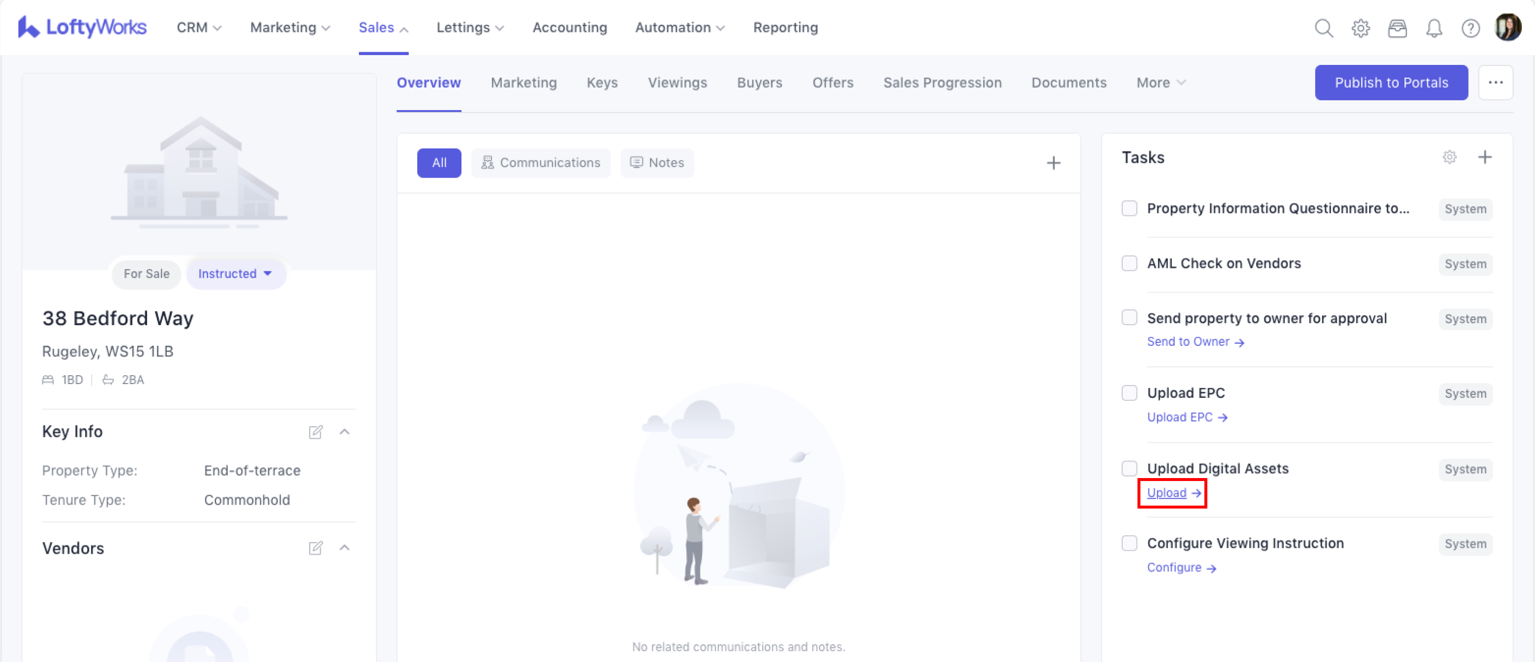 (2)If a property has been marked as Instructed but does not yet have any images, a task appears in the overview tab on property's detail page prompting you to upload digital assets. Clicking Upload in the task opens the Marketing Tab with the Creative & Launch Kit ready for use, guiding you to add the essential media needed before marketing begins.