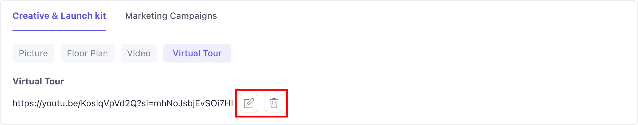 Virtual tours links can also be edited or deleted. Once saved, they appear in both the Marketing Tab and the Add/Edit Property media section.