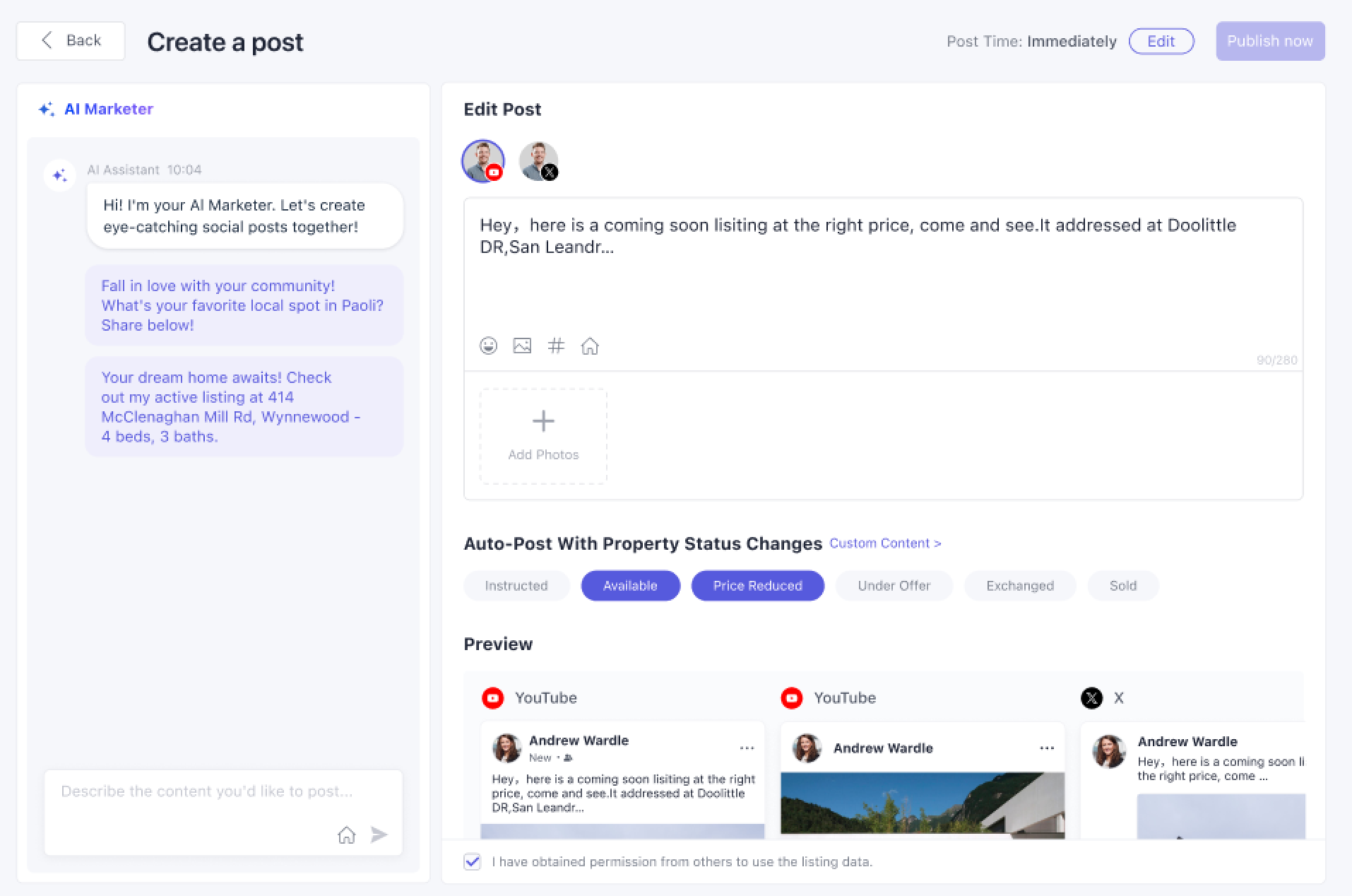 Shows all property portals and social platforms where the property is currently published.