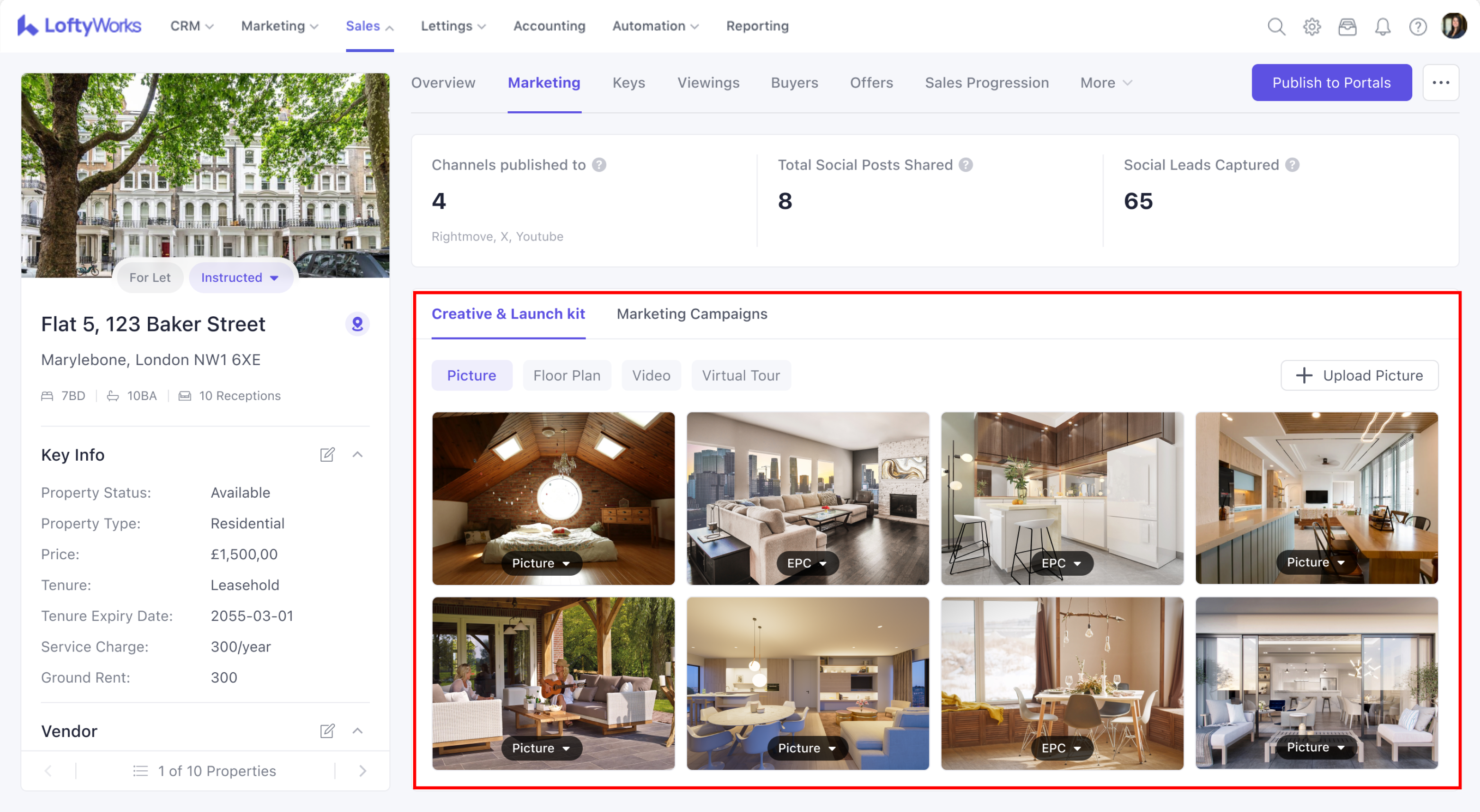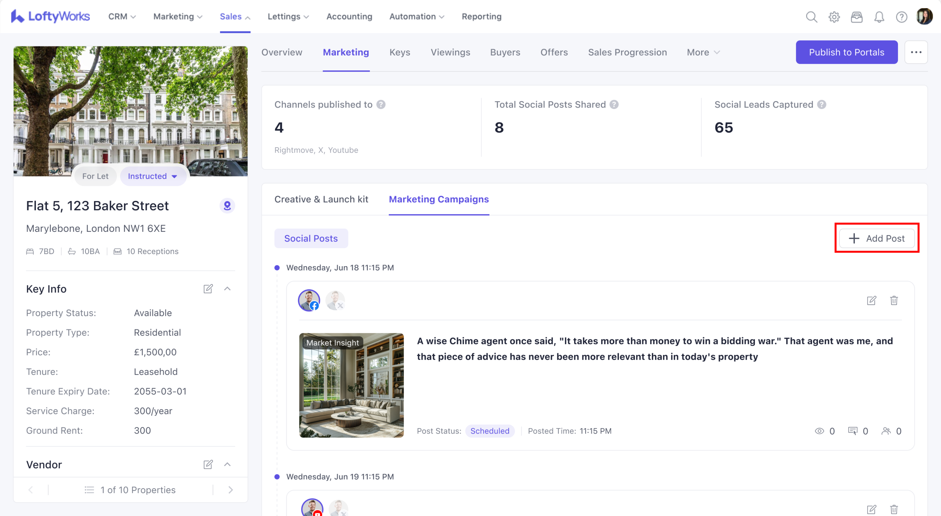 The top section of the Marketing Tab summarises how the property is being promoted. It shows where the property is published, how many social posts have been created, how many people have viewed those posts and how many contacts have come from them.
