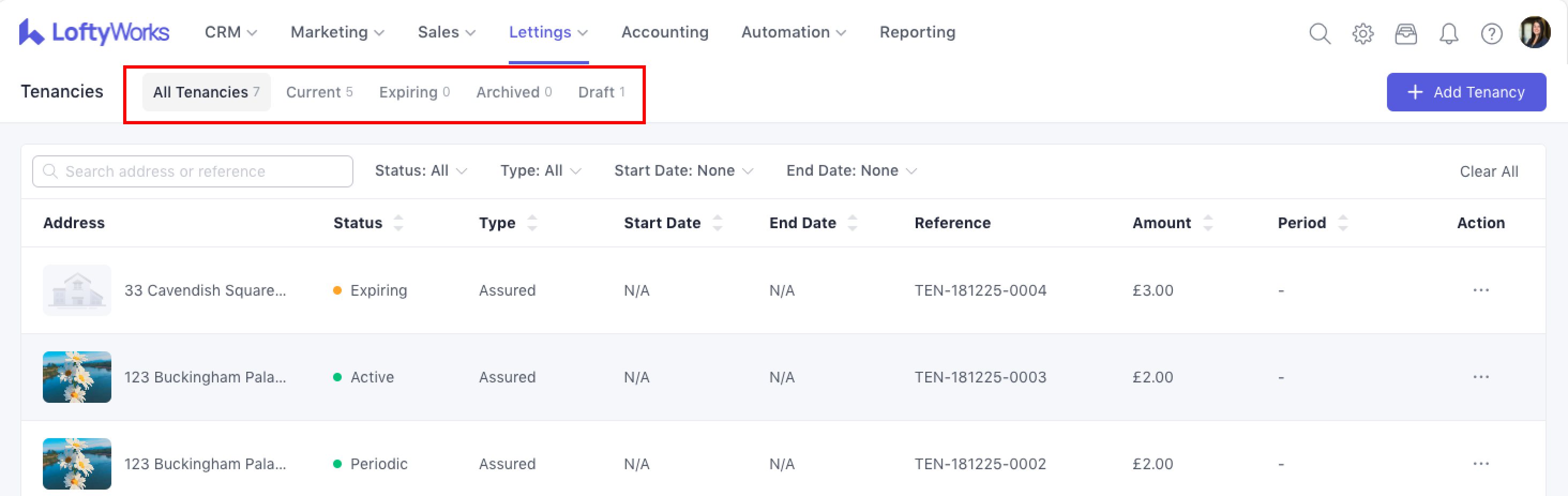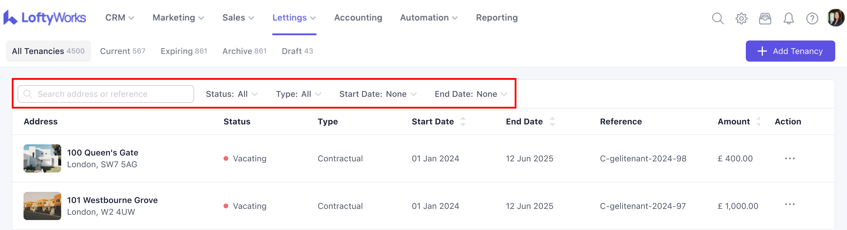 At the top of the page, you'll find several tabs that group tenancies by their status. These tabs make it easier to navigate large portfolios.