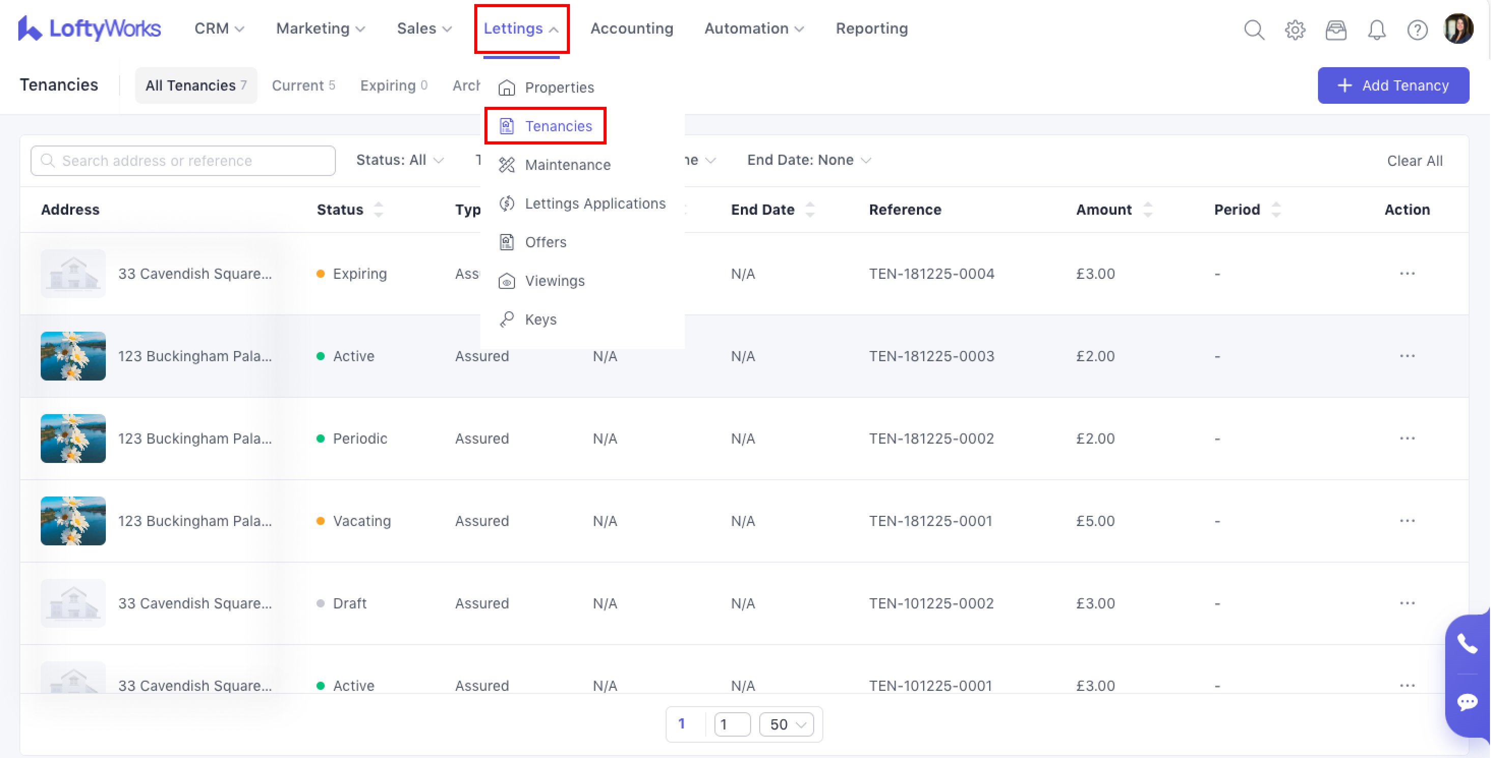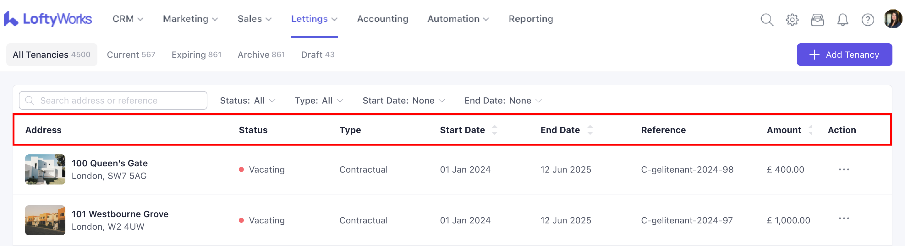 The Tenancy List provides an organised overview of all tenancy records managed within LoftyWorks. It helps you quickly locate tenancies, check their current stage and take relevant actions such as editing or duplicating a record. You can access this section from the Lettings module.