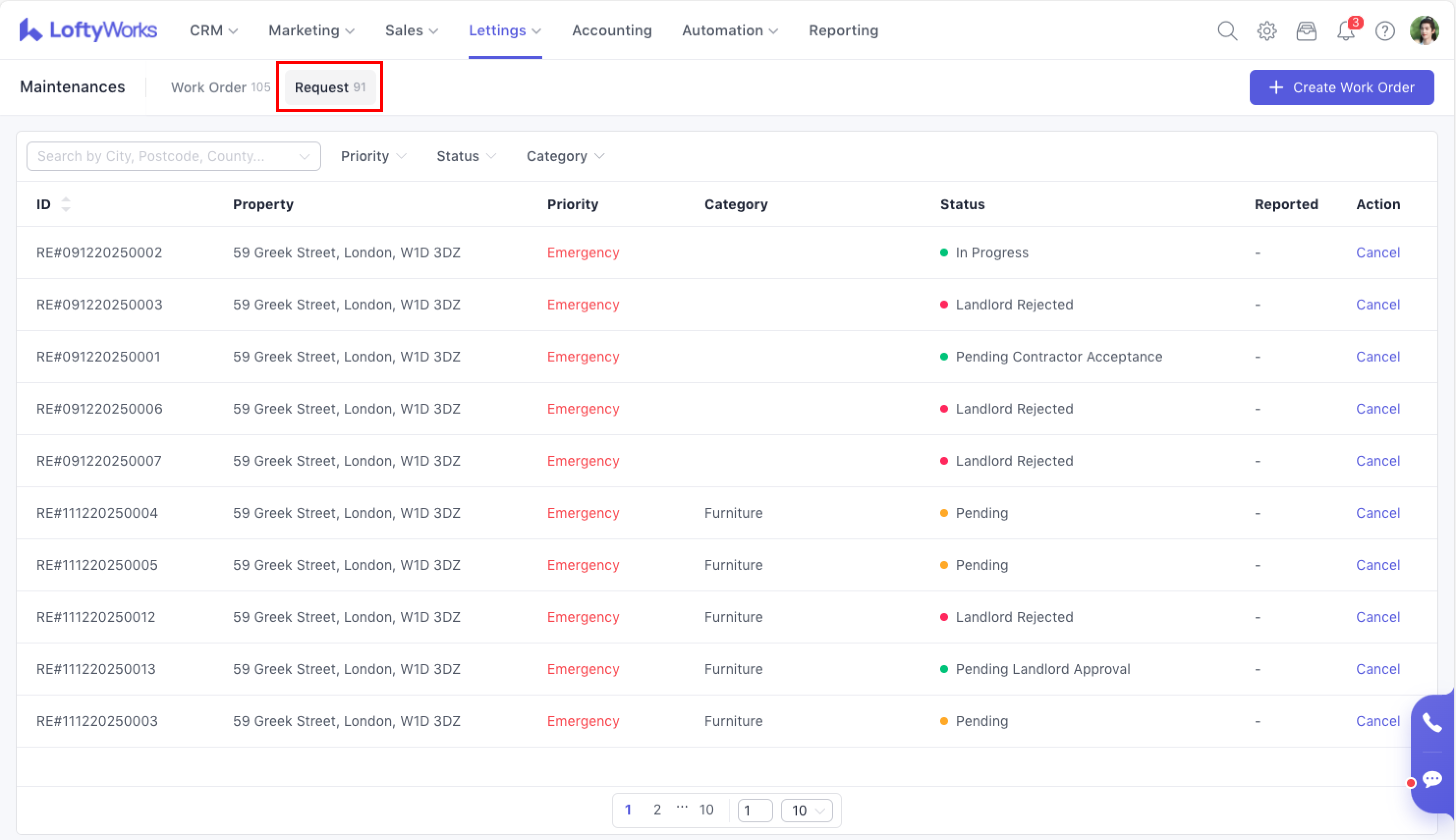 Both tabs allow you to search by property address and apply filters for category and priority. You can also use status to search in Work Order tab.