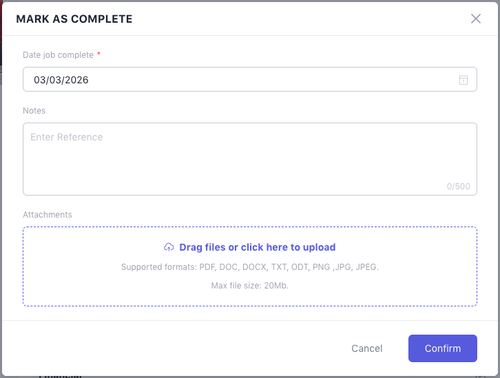 You can edit details at any time, such as changing contractors or updating attachments. Once the contractor marks the job as completed, you can confirm completion by selecting the completion date and adding any final notes or attachments.