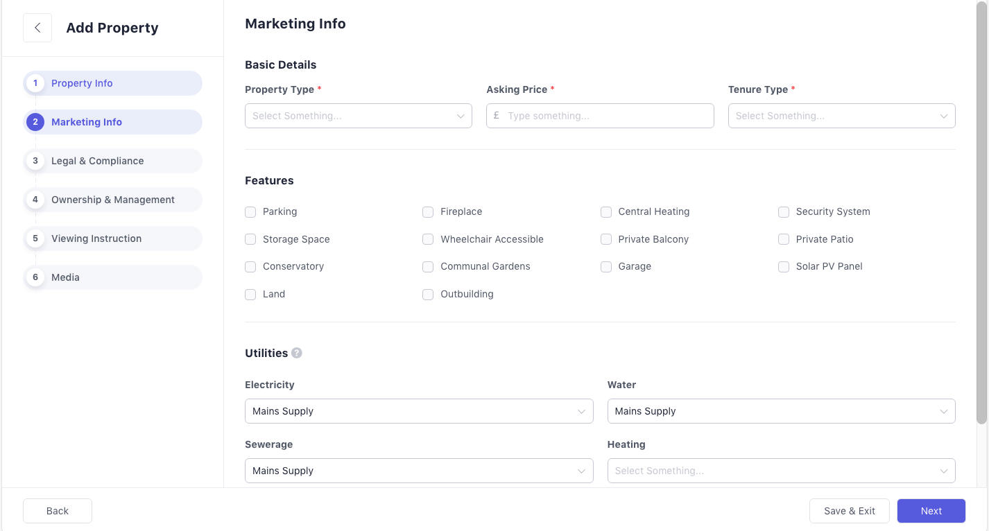 In the Marketing Info step, you are required to enter the property type (e.g., Bungalow, Apartment, Terraced, Land), asking price, and tenure type. You can also add information about features (e.g., Parking, Fireplace, Storage Space, Private Balcony) and utilities (e.g., electricity, water, heating) to make your property details more complete.