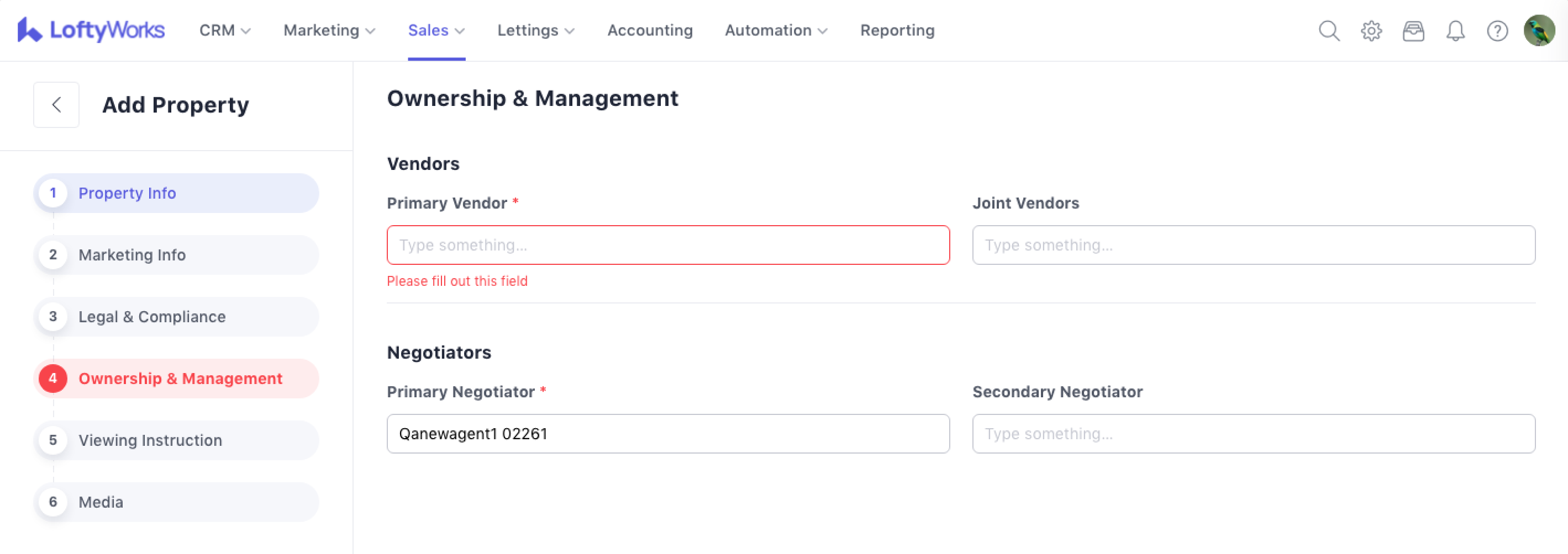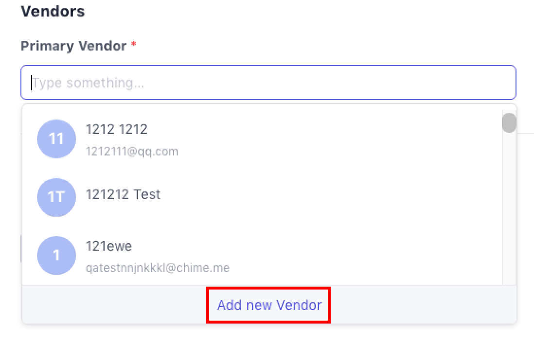 This step lets you assign the property’s vendor. You can choose from existing contacts or create new ones directly from the form.