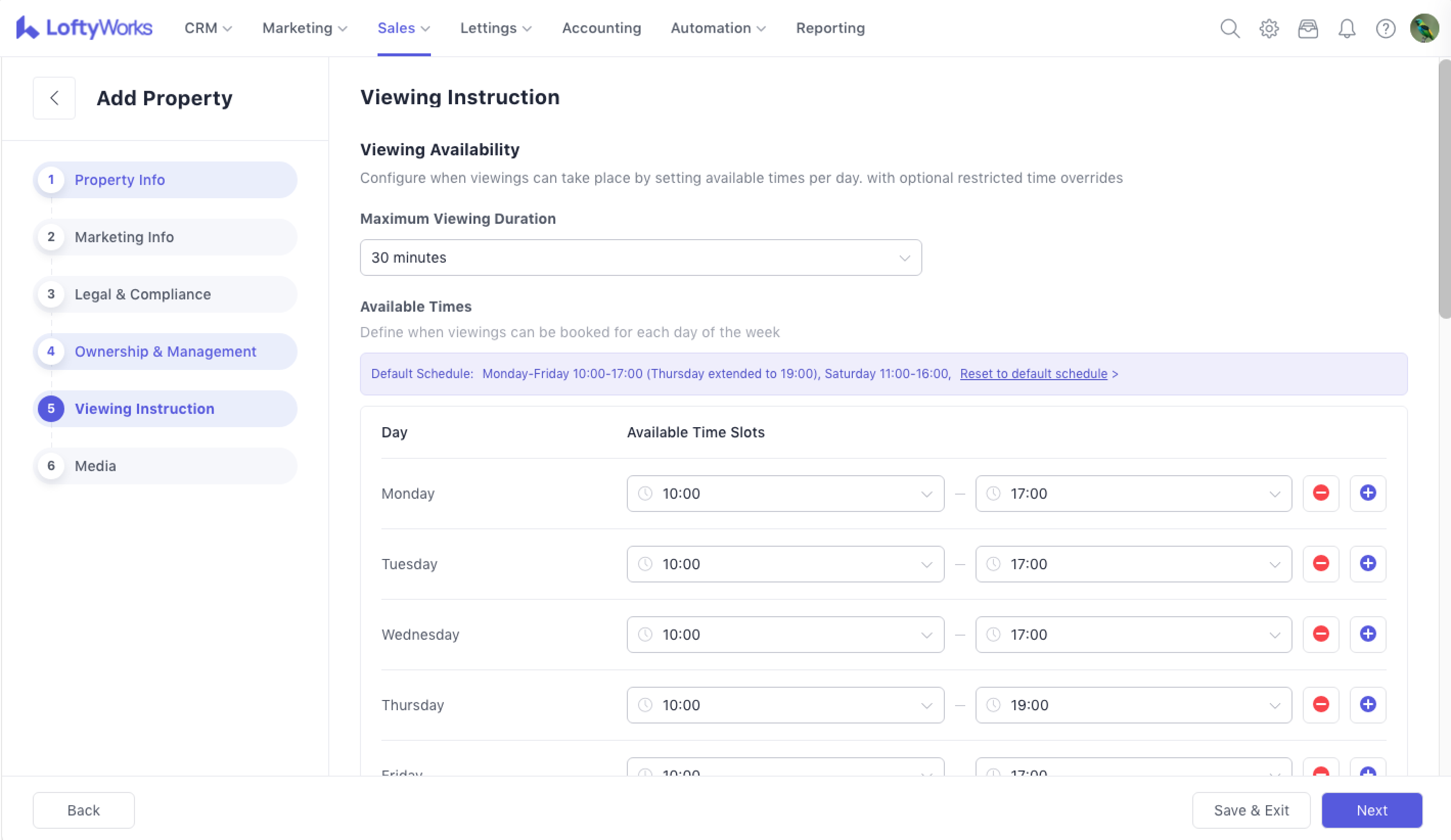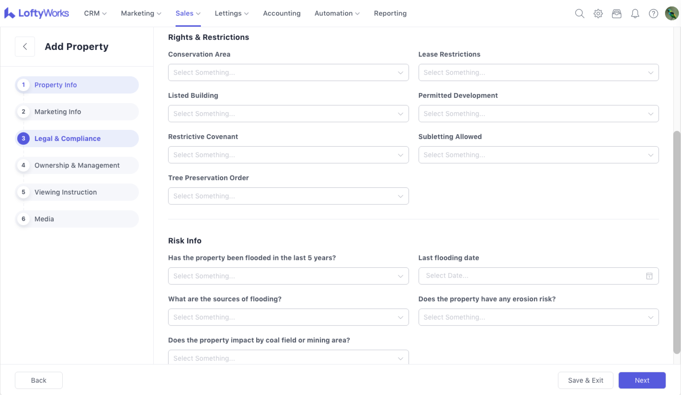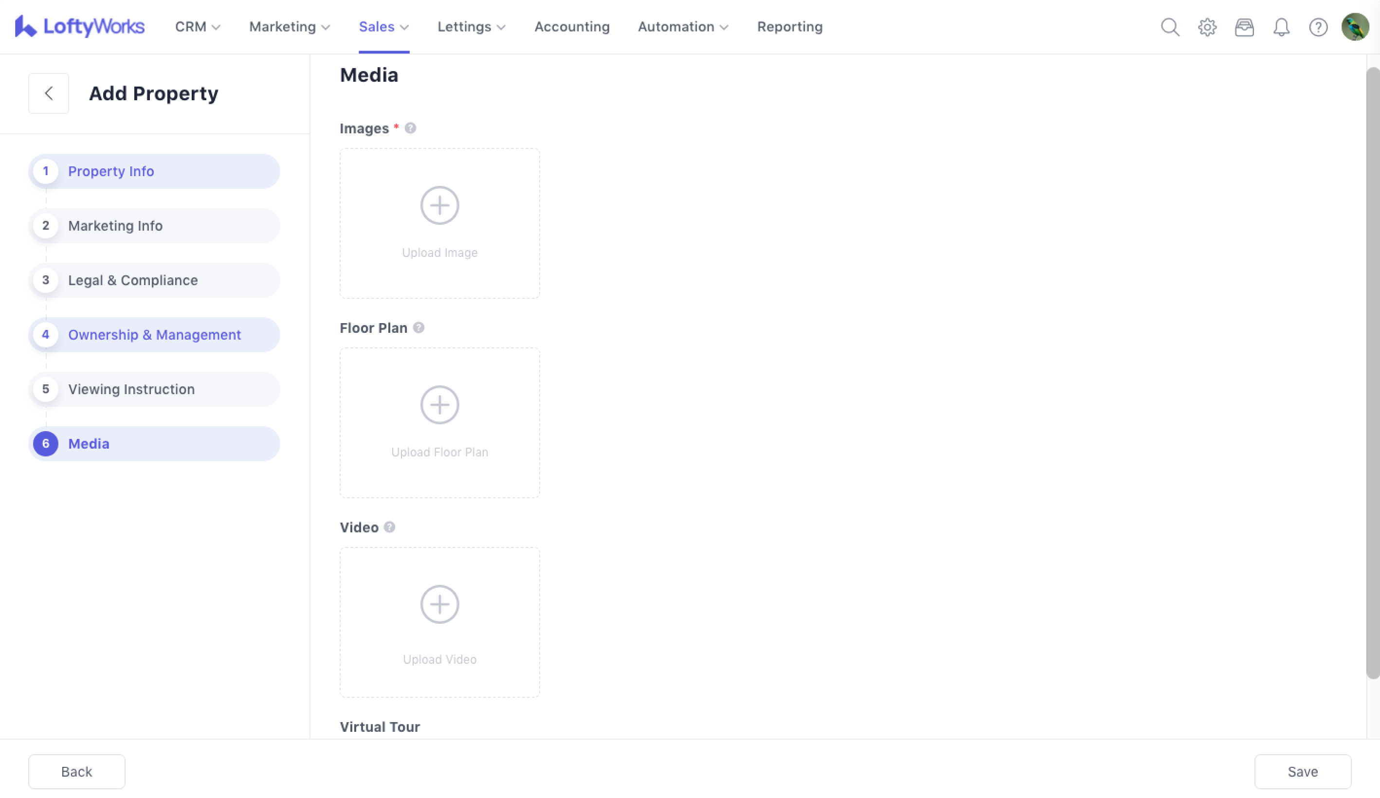 The Add / Edit Property feature allows you to create new property records or update existing ones. The process is guided through several steps, ensuring that essential information is captured accurately for sales.