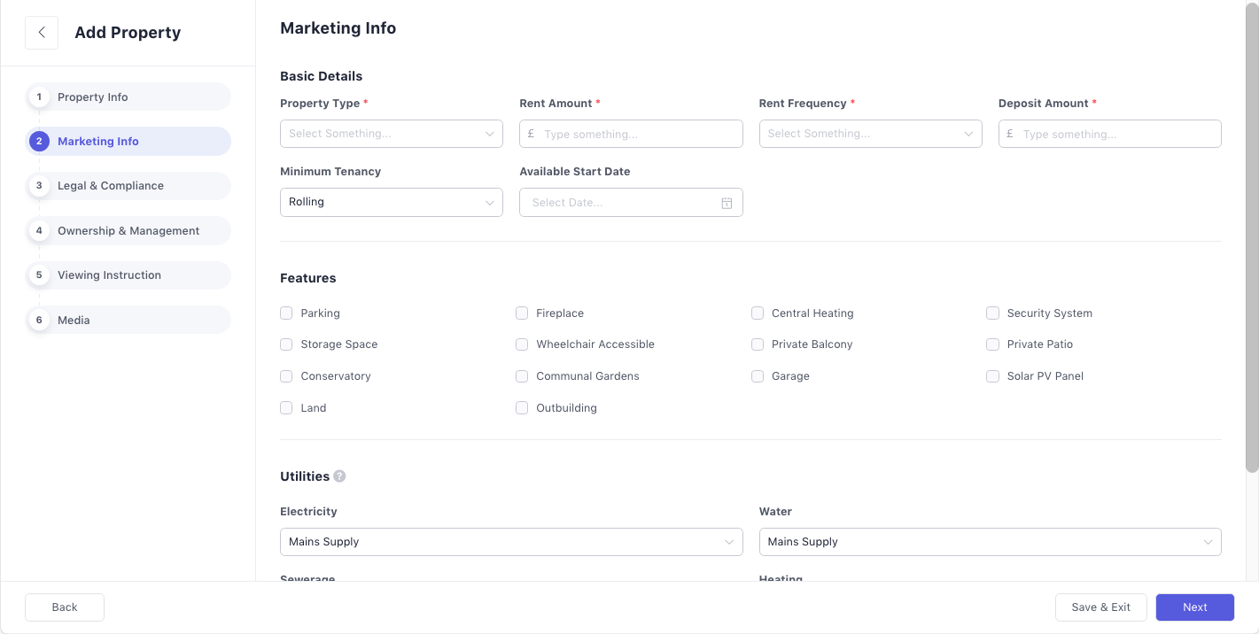 In the Marketing Info step, you are required to enter the property type (e.g., Bungalow, Apartment, Terraced, Land), rent amount, rent frequency and deposit amount. You can also add information about features (e.g., Parking, Fireplace, Storage Space, Private Balcony) and utilities (e.g., electricity, water, heating) to make your property details more complete.