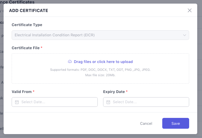 Certificates must include File, Valid From and Expiry Date. These fields are required to ensure compliance before marketing: