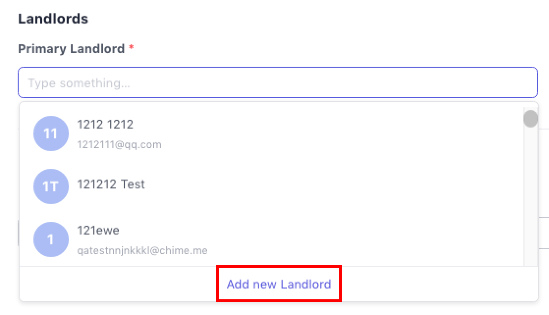 This step lets you assign the property’s landlord. You can choose from existing contacts or create new ones directly from the form.