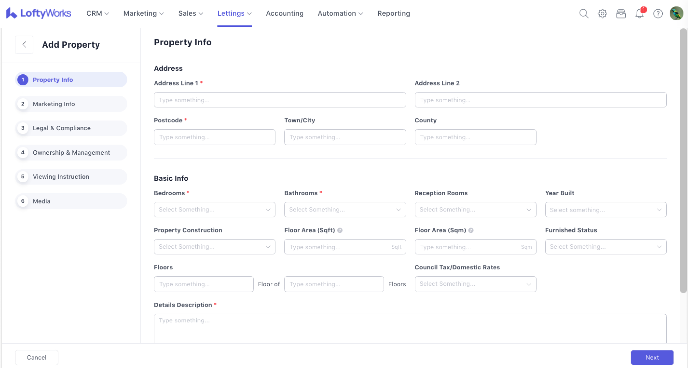In the Property Info step, you must enter the address, postcode, and the number of bedrooms and bathrooms, along with a details description of the property. You can also provide additional basic details such as the year built and furnished status...