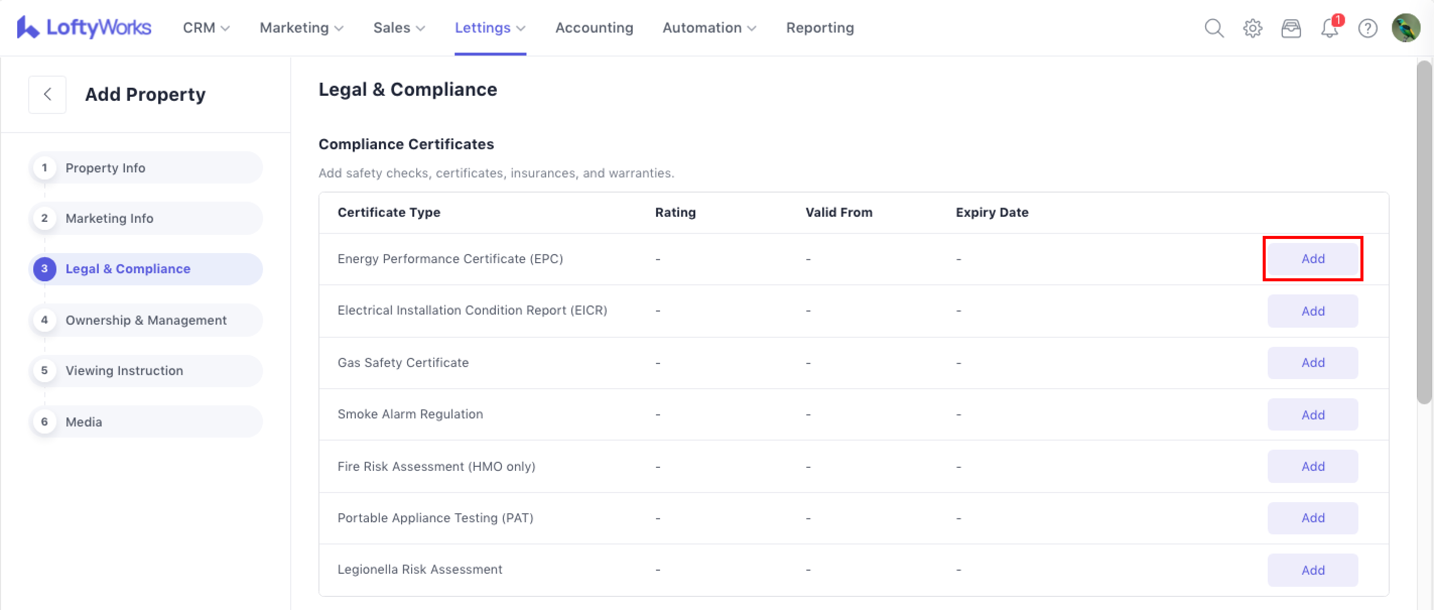 For to-let properties, you can add seven types of compliance certificate: Display Types: Energy Performance Certificate (EPC), Electrical Installation Condition Report (EICR), Gas Safety Certificate, Smoke Alarm Regulation, Fire Risk Assessment (HMO only), Portable Appliance Testing (PAT) and Legionella Risk Assessment.