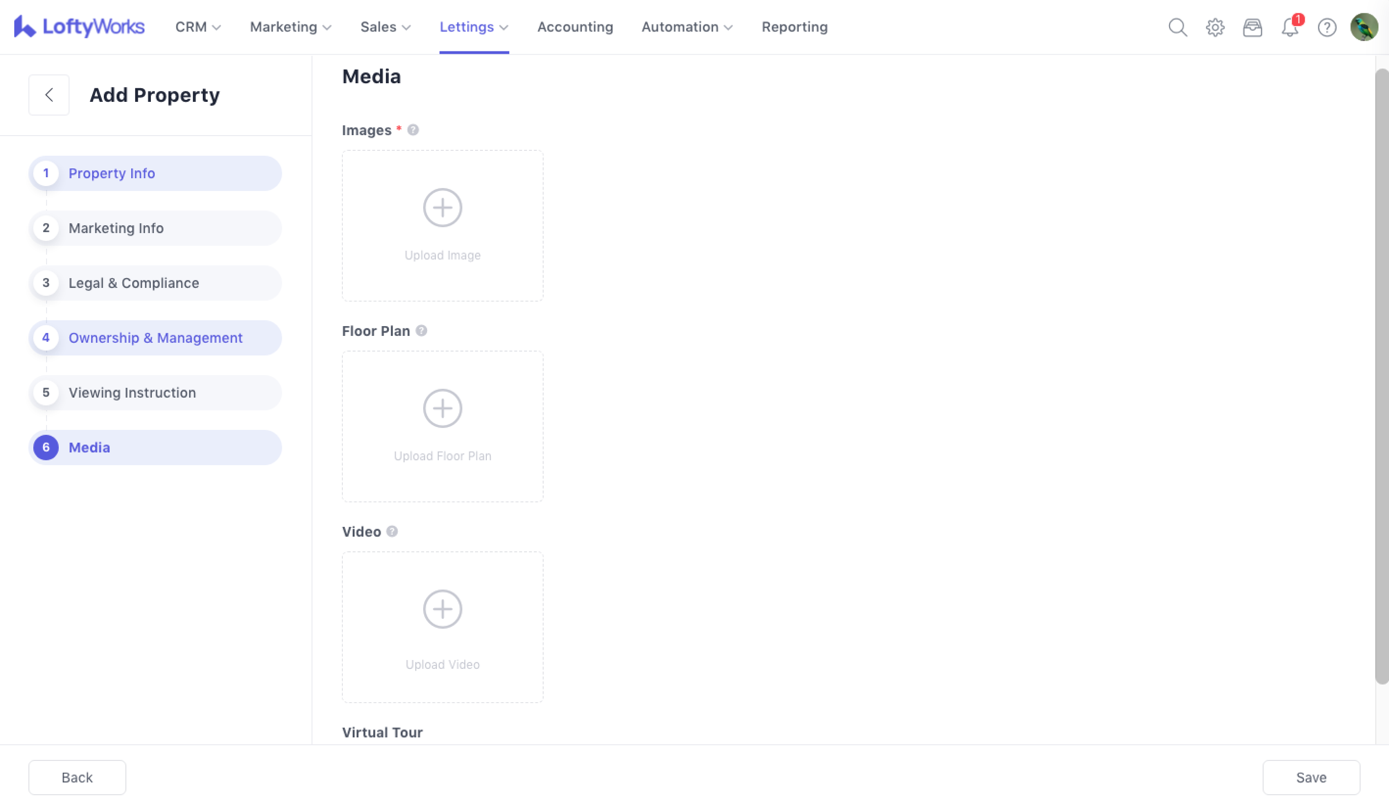 You can upload multiple property images at once. Floor plan, video and virtual tour link are optional.