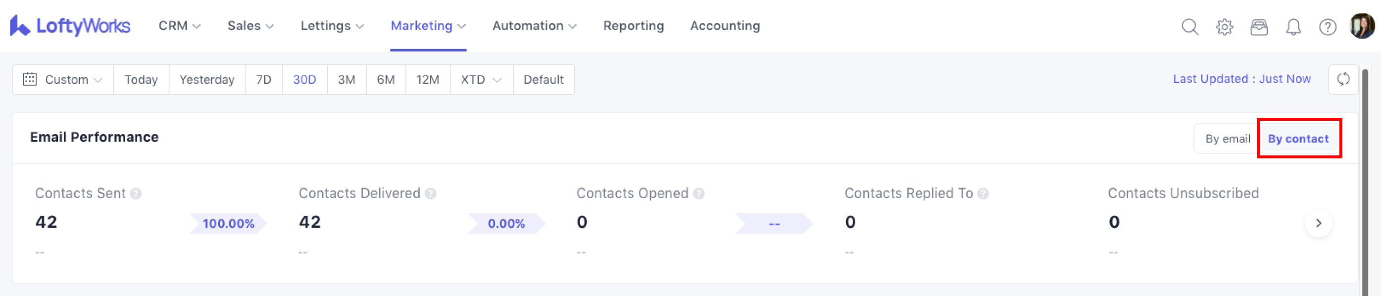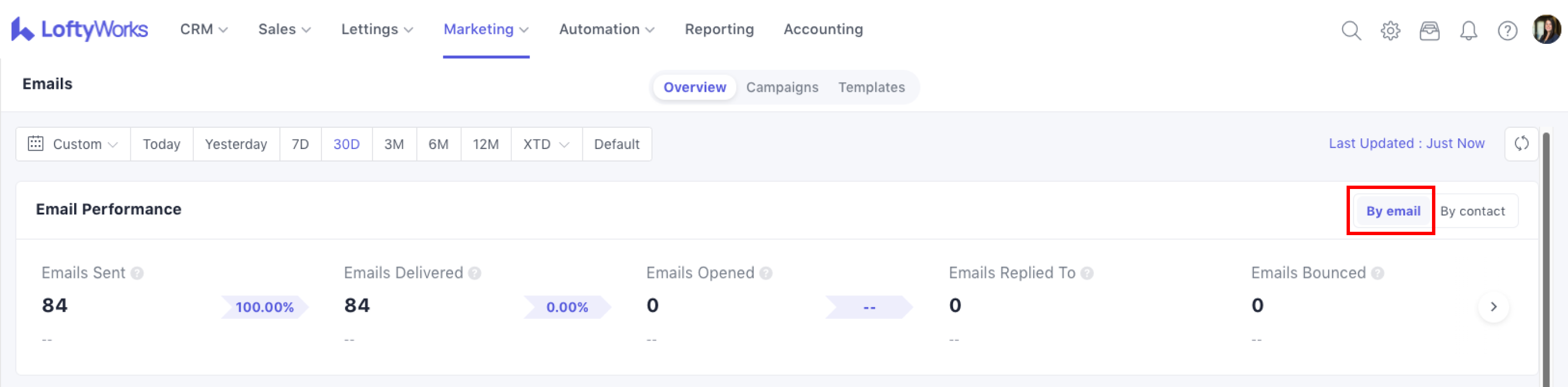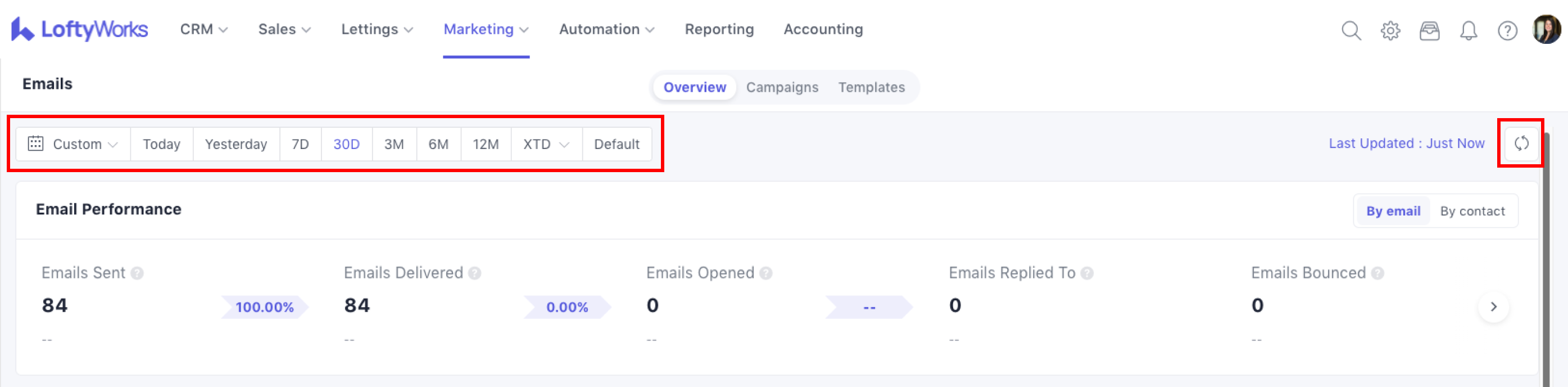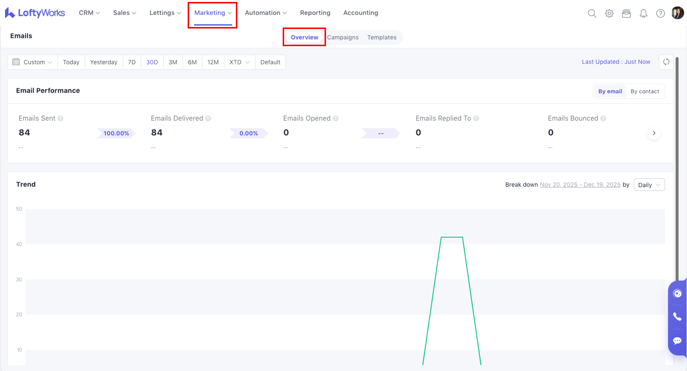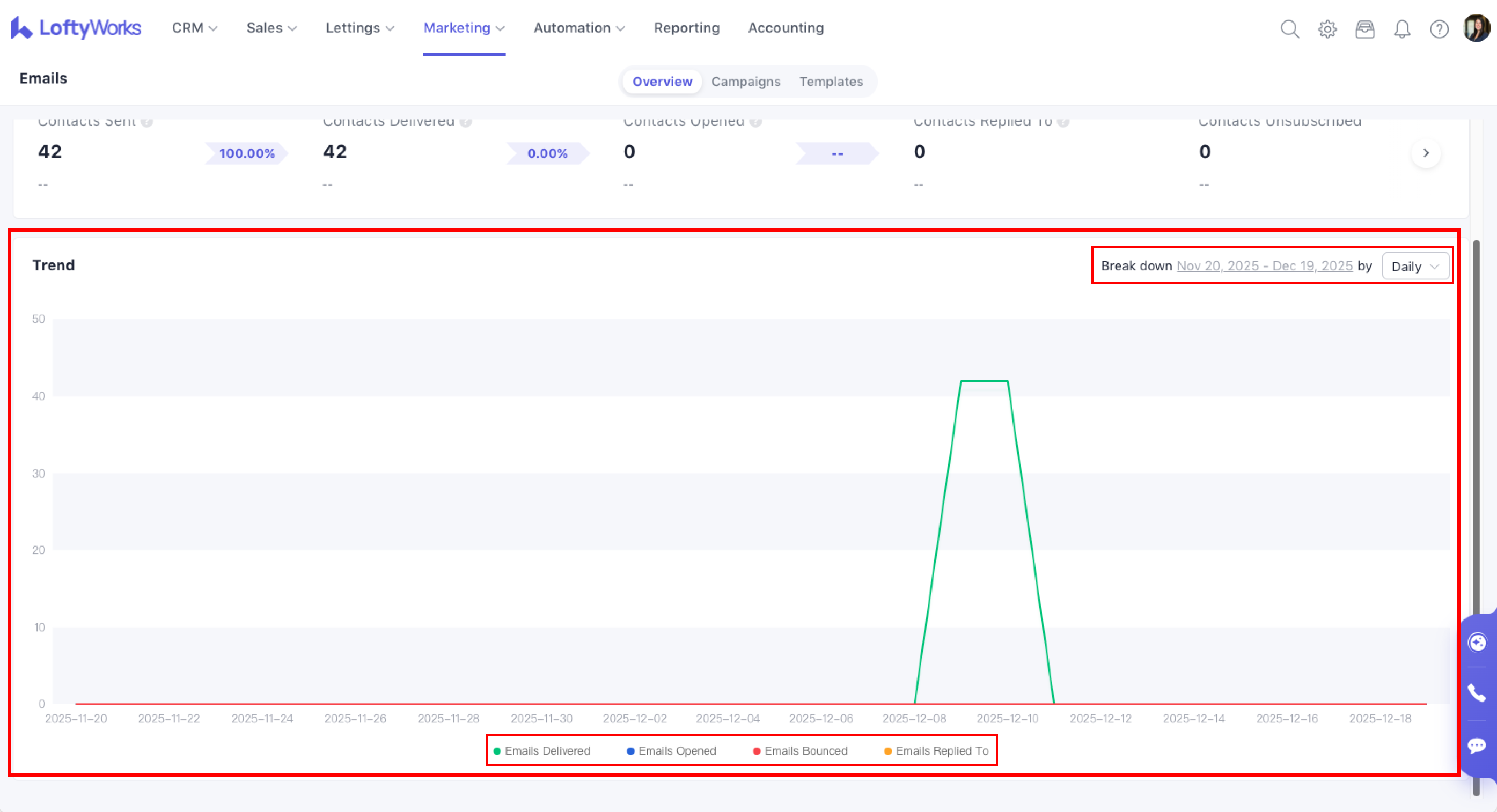 The Email Overview page gives you a clear picture of how your email activity is performing across LoftyWorks. It helps you understand whether your emails are being delivered, opened and engaged with, and highlights any issues such as bounced messages.