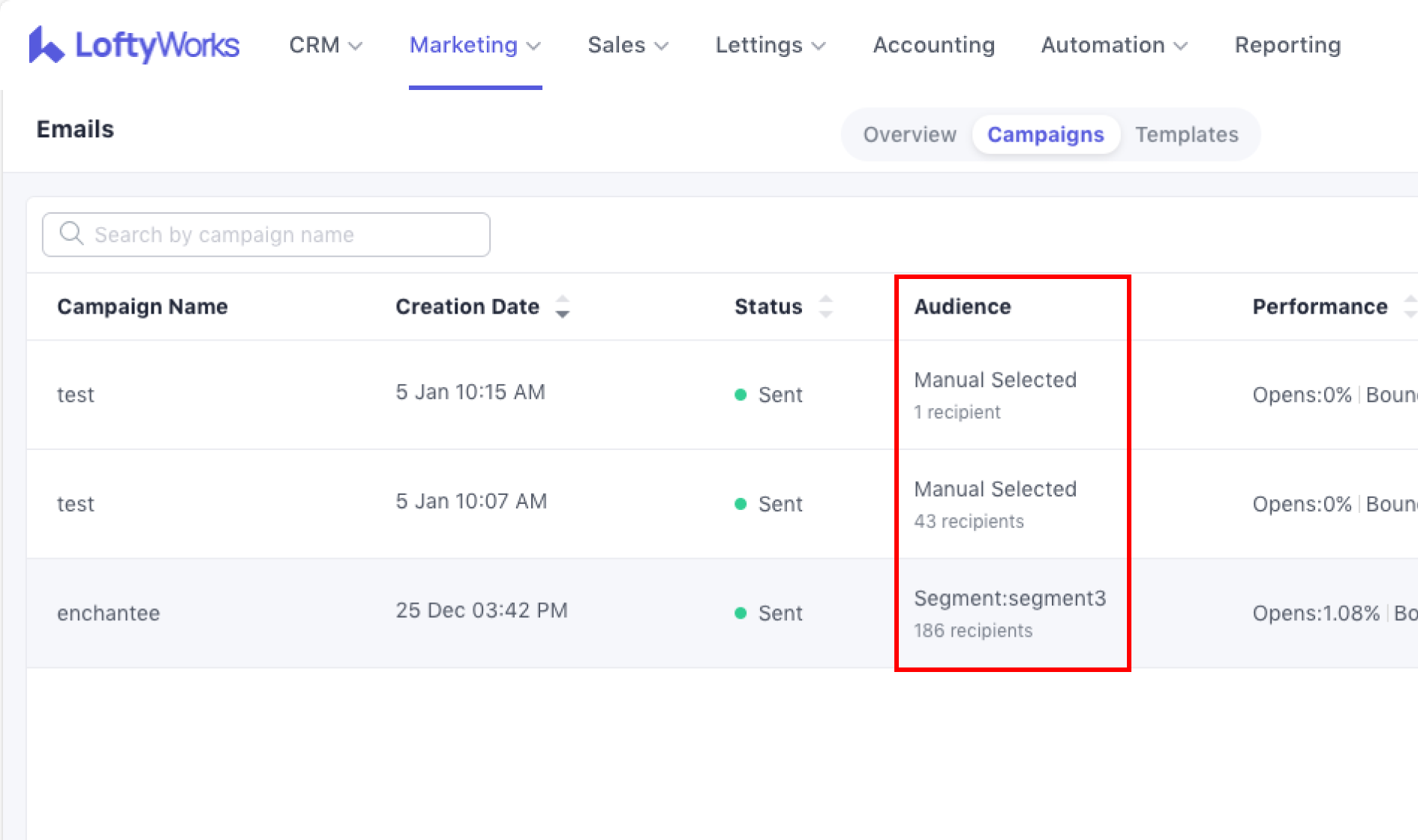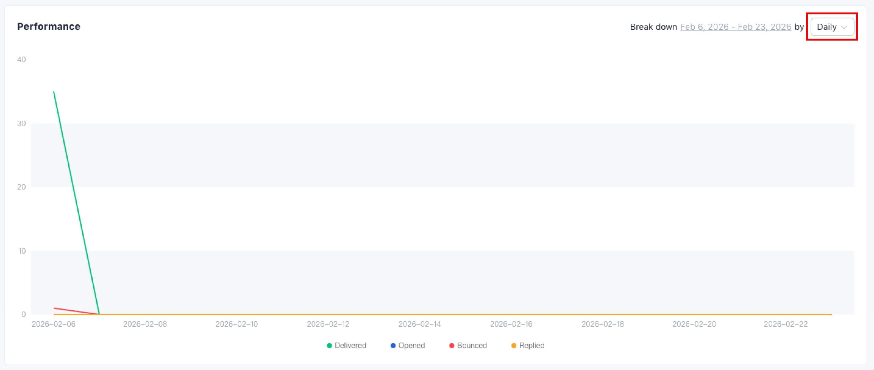 Performance – opens, clicks, replies and bounces (for sent campaigns)
