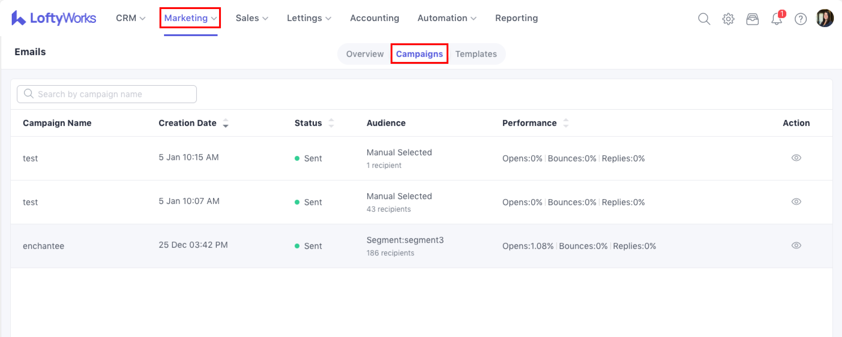 You can use the search bar to find campaigns by name, even if you only remember part of the subject line. Column headers can be clicked to sort campaigns by creation date, status, or performance metrics such as opens, clicks, replies or bounces.