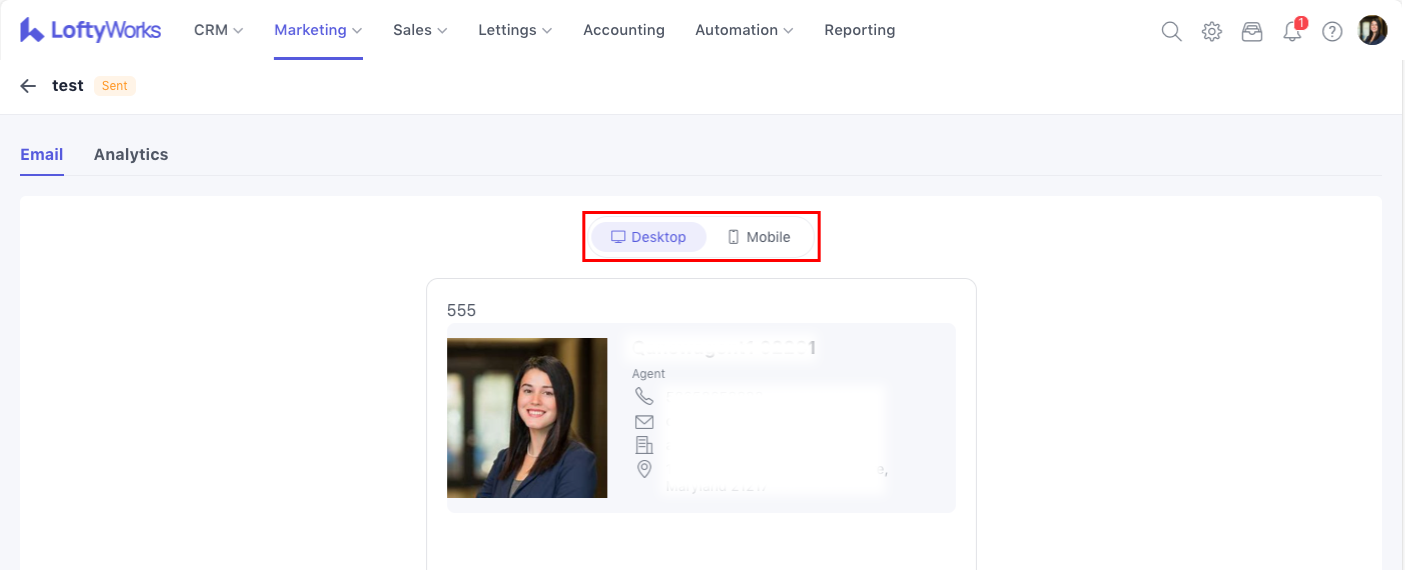 This tab shows a preview of the email. You can switch between desktop and mobile views to check how the email will appear to recipients.