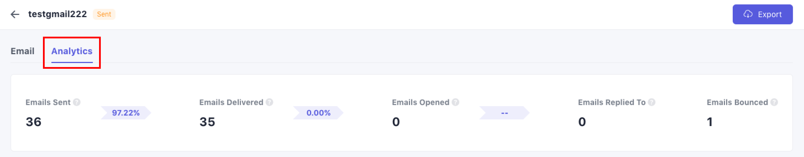 The Analytics tab is available only after an email has been sent. For sent campaigns, this tab opens by default. It is divided into three sections: