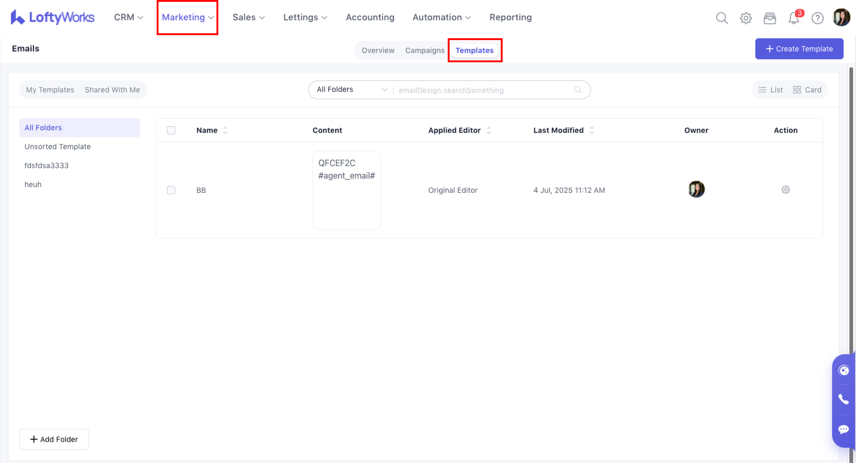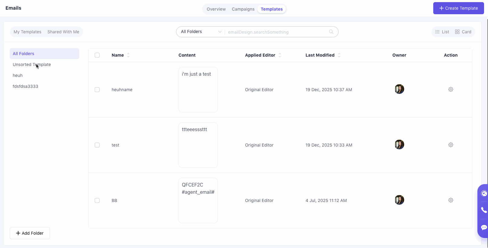 Click Create Template at top right corner to start a new email template.