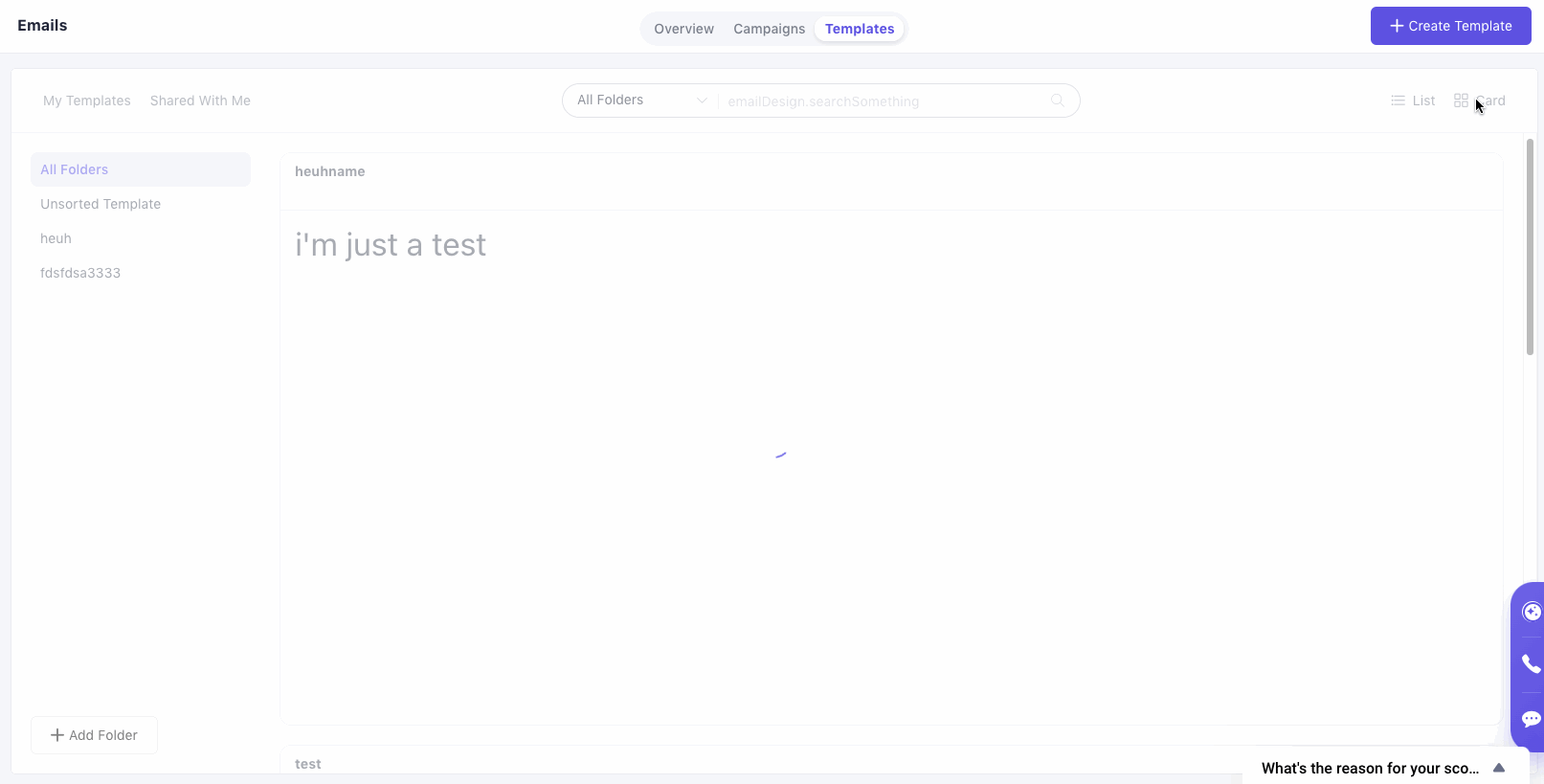 Folders help you organise templates by purpose, team or campaign type. Selecting a folder filters the templates shown on the right.