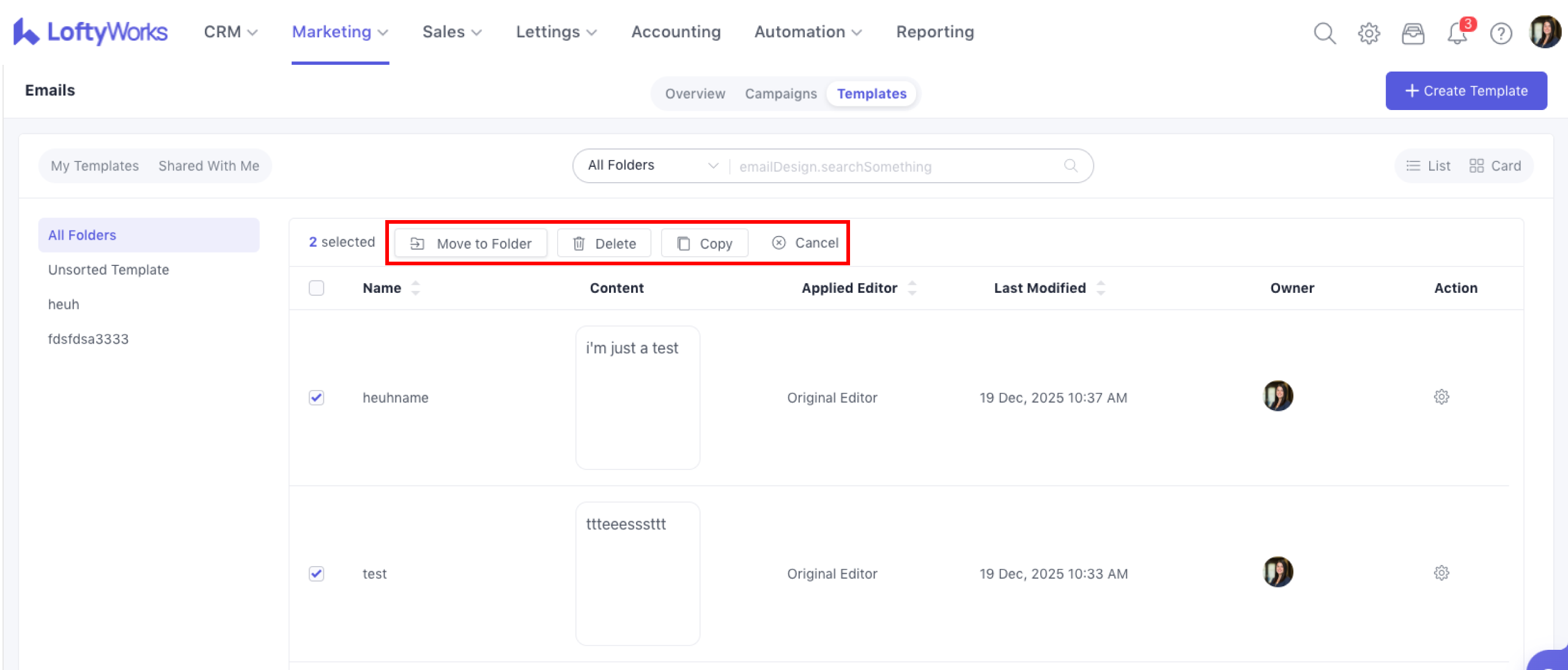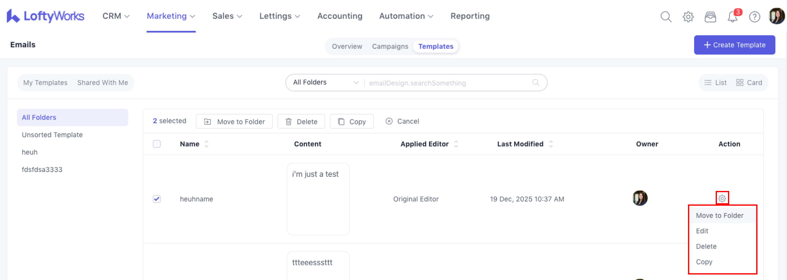 Move to Folder – organise templates into folders