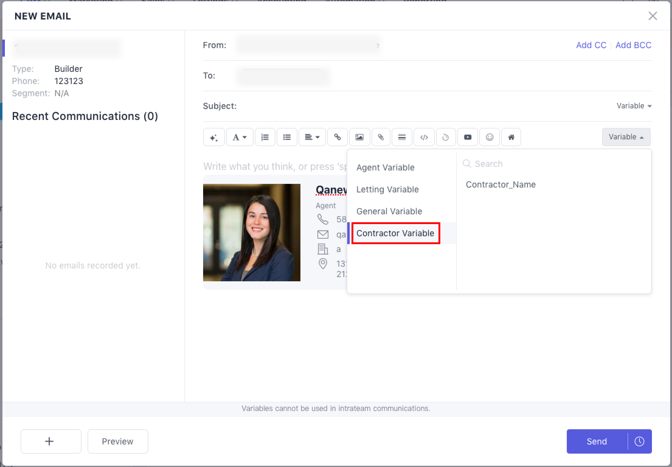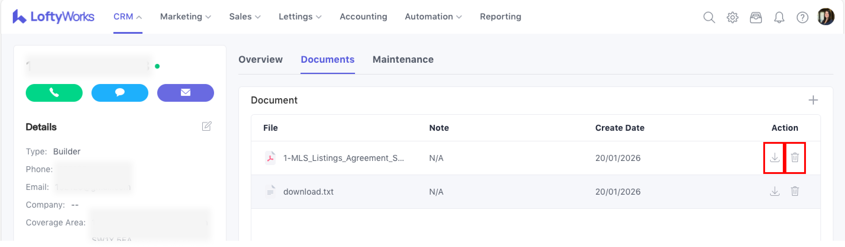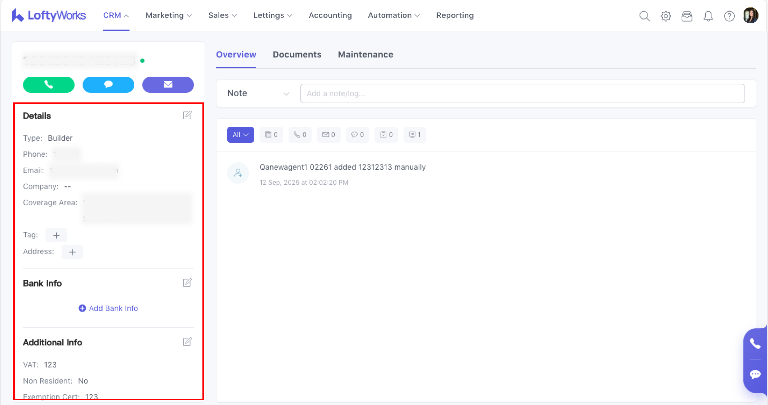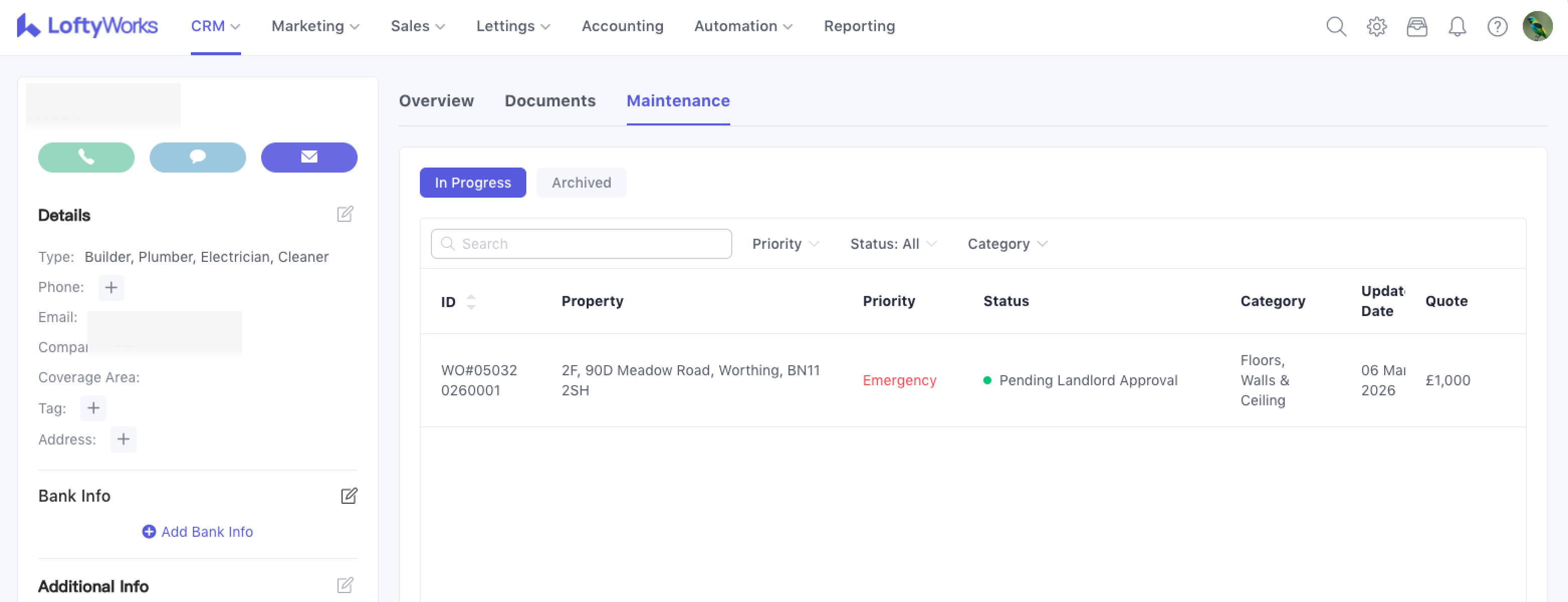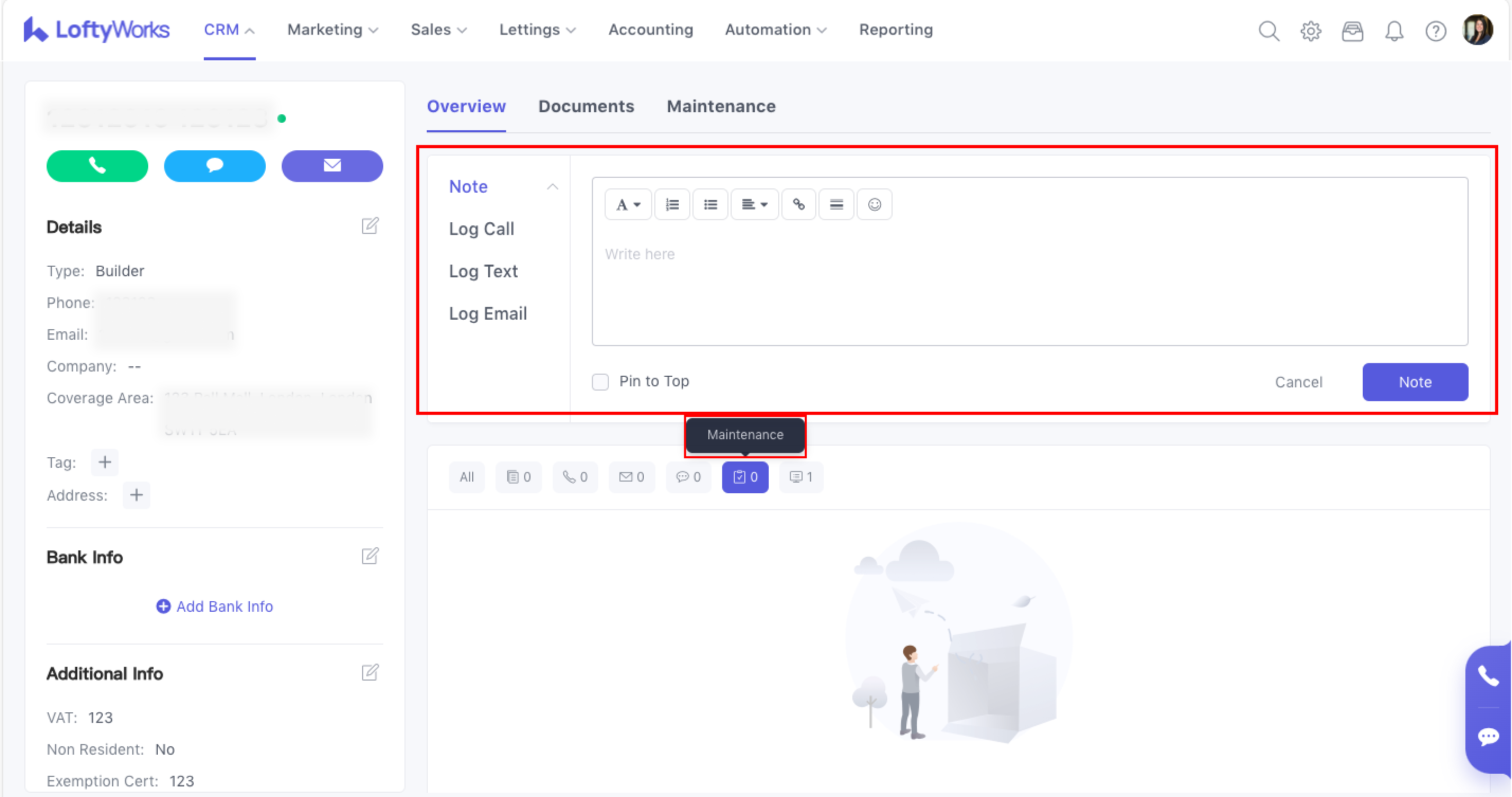 Similar to the Overview tab in contact's detail page, here you can view/add notes and communication logs, maintenance logs about this contractor, maintenance logs will also be displayed here: