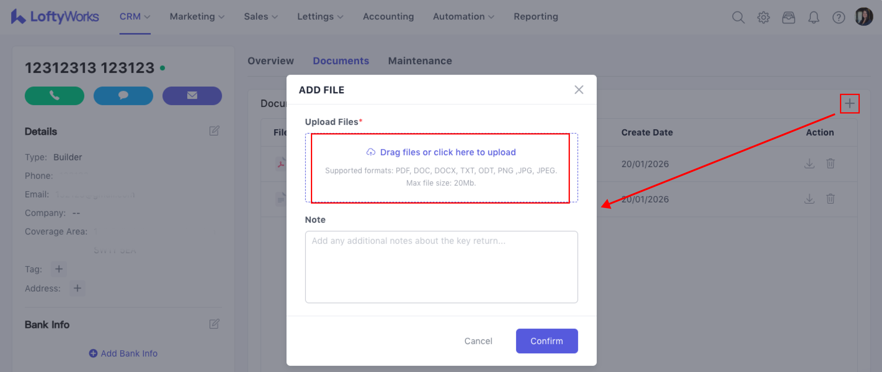 Click on the + icon at top-right corner to upload files and add notes for them. You can either drag file or click here to upload: