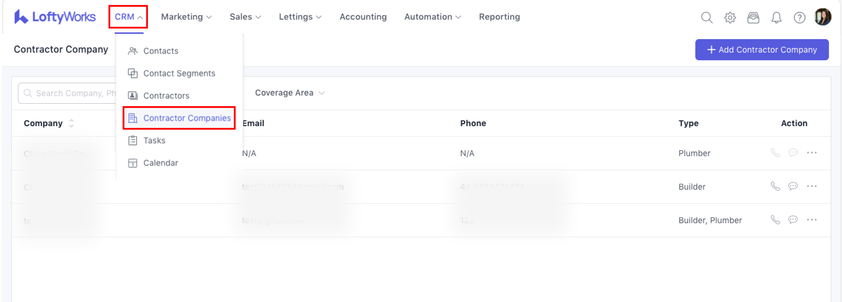 You can access contractors by CRM → Contractor Companies.